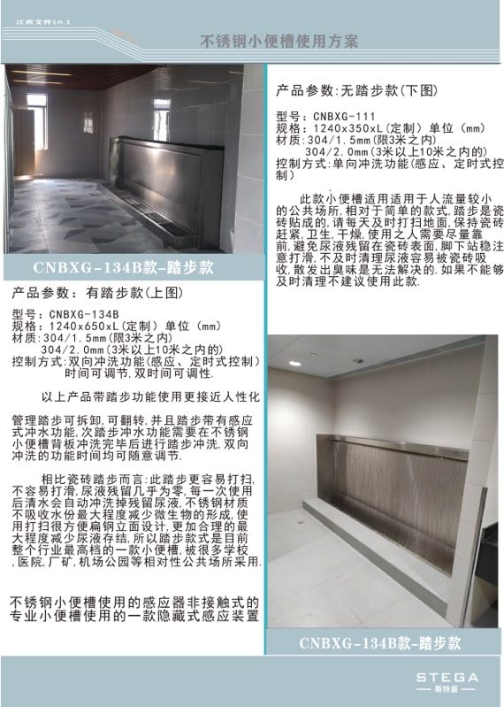 公司的前身是上海杰尔机电节能设备公司,成立于1993年10月,也是原上海力三。斯特嘉环保科技(上海)有限公司现和在继承上届公司的全部班底及产品的研发技术后,继续充实新公司的力量。目前公司内部稳定,业务充实。借此,向新老公司客户及供应商表示感谢! 公司目前生产产品有五大类,十多个品种,以“斯特嘉”品牌为本公司(不锈钢小便槽)产品商标,为社会做出了本公司应有的贡献,特别是集“节水,卫生”于一体的《JL-5型厕所自动冲水器系列》《不锈钢小便池》《全自动粉碎排污泵》《电马桶》《光控感应装置》等产品更是适应社会节能需求,为节约水电资源做出了贡献! 例如:本公司在2005年7月应宝钢集团上海五钢有限公司要求安装于厂宿舍厕所的自动冲水装置,达到单只水箱月节水量近400吨的成绩,(见实例展示) 为企业节水做出了贡献。在2007年初设计安装 坐落在上海闵行区剑川路上的“上海交通大学新建体育馆” 不锈钢小便槽及配套感应自动冲水工程,其中不锈钢小便池长度达20.4米,创造了目前国内不锈钢小便槽单座长,制作和安装难度高的记录,也是本公司完成众多不锈钢小便槽中产品。并获得了不锈钢小便槽多项ZL, 近几年本公司还承接 了上海世博会旅游集散中心项目,参与了江苏常州花博会工程,南京民生工程,响应了厕所修改,南京市浦口区区对下属部分学校实施了厕所修改,对 老厕所进行了提升。 2019年承接了上海浦东机场二期工程及2020上海浦东足球足球场新建工程 都有我们不锈钢小便槽的改造 。 我们将对产品在实际安装中例举大量的实例供大家参考 ,针对您单位的实际情况选择定制本公司的合适产 品 。 以上是316L304不锈钢小便槽的详细介绍,包括316L304不锈钢产品的价格,型号,图片,产地,品牌等信息。