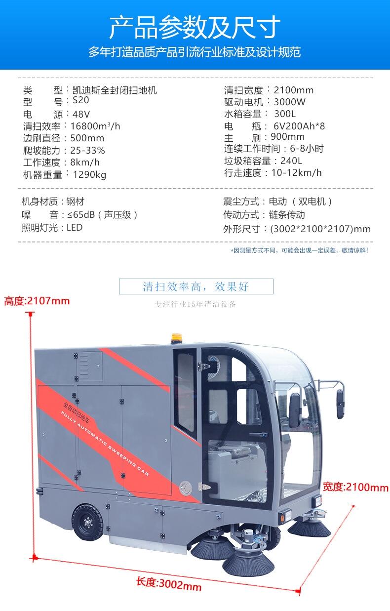 S20型全封闭驾驶式扫地机是扫地、喷水、吸尘相结合的自动半封闭驾驶式清洁能源综合机器。