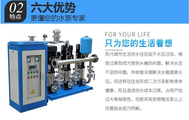 1、技术先进:设备将真空抑制技术、流体控制技术和智能变频技术等多项先进技术进行优化融合,便给水设备与自来水管网直接串接,实现稳压、节能、卫生、可靠运行,不产生负压,不用建水池、水箱。