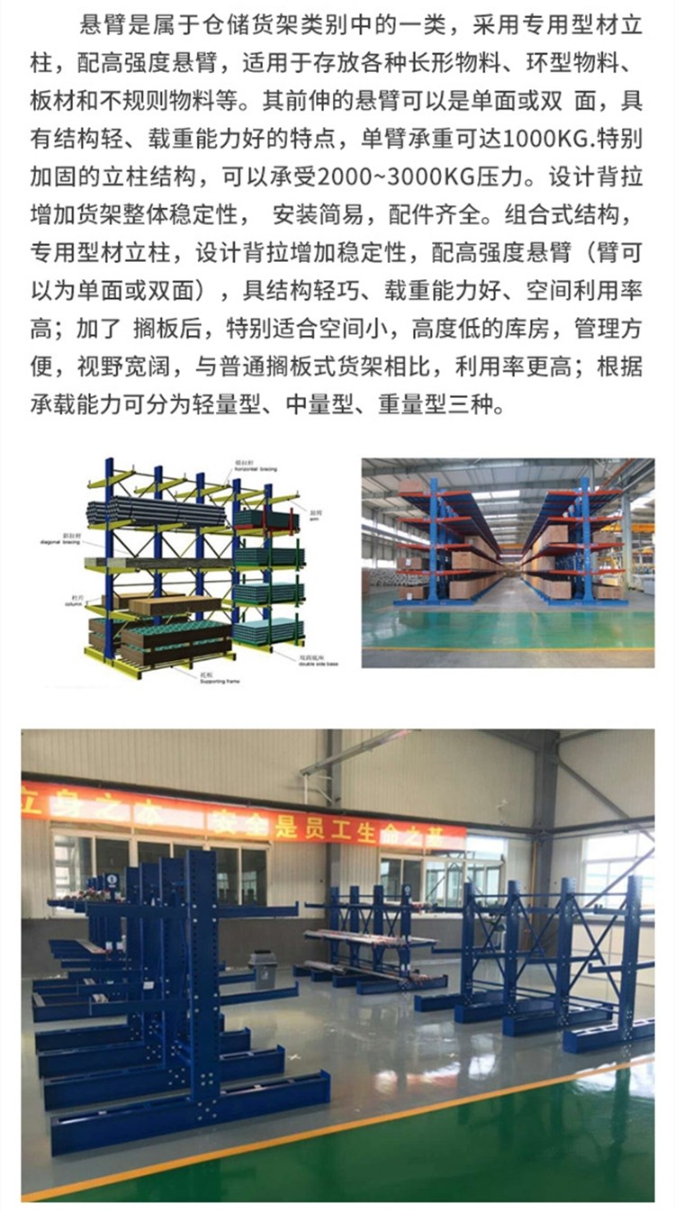 ·产品说明:悬臂货架适用于放长物料,环形物料,板材钢材及不规则的货物。