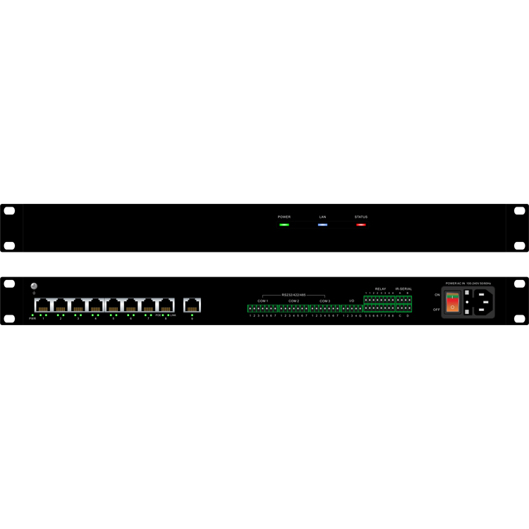 7、8路网络协助端口,每个端口支持标准POE供电,可对接音视频设备和外围控制设备