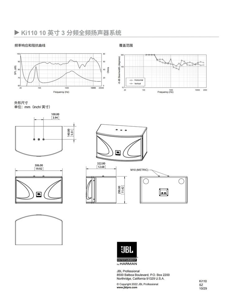 Ki100 扬声器系列专为卡拉 OK 市场而设计。Ki100 系列包括两个三路无源扬声器:Ki110(10 英寸)和 Ki112(12 英寸)。Ki100 系列扬声器采用优雅的黑色集成格栅和两个 M10 连接点,方便安装在卡拉 OK 房间。每个扬声器型号均配备两个 3 英寸锥形中音驱动器和两个 3 英寸锥形高音扬声器,提供出色的低音和人声再现。凭借 JBL 在扬声器开发方面的传奇技术和知识,Ki100 系列扬声器是满足需求的产品在卡拉 OK 声音中再现。