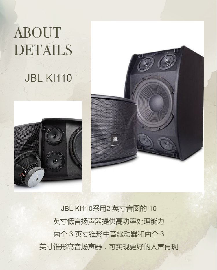 Ki110是一款专为卡拉OK市场需求而设计的三路全频音箱。Ki110 使用一个 10 英寸低音扬声器、两个 3 英寸锥形中音驱动器和两个 3 英寸锥形高音扬声器。