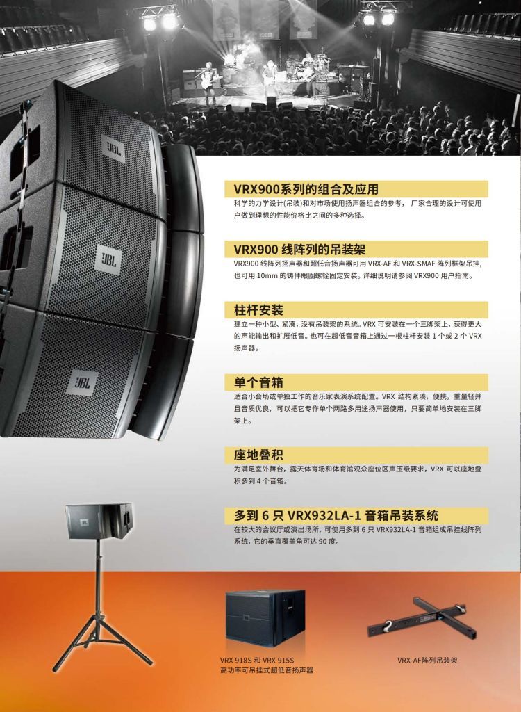 VRX900 系列扬声器采用了 JBL 著名的 VERTEC 系列远投射高性能大型线阵列扬声器的设计技术和优秀组件,并按照世界流动演出工业标准生产。非常完美地适合各类中小型厅堂地扩声应用。VRX 比 VERTEC 线阵列扬声器设计得更为紧凑和便于携带,拥有惊人的功率传送能力,清晰的声音和灵活的安装方式。