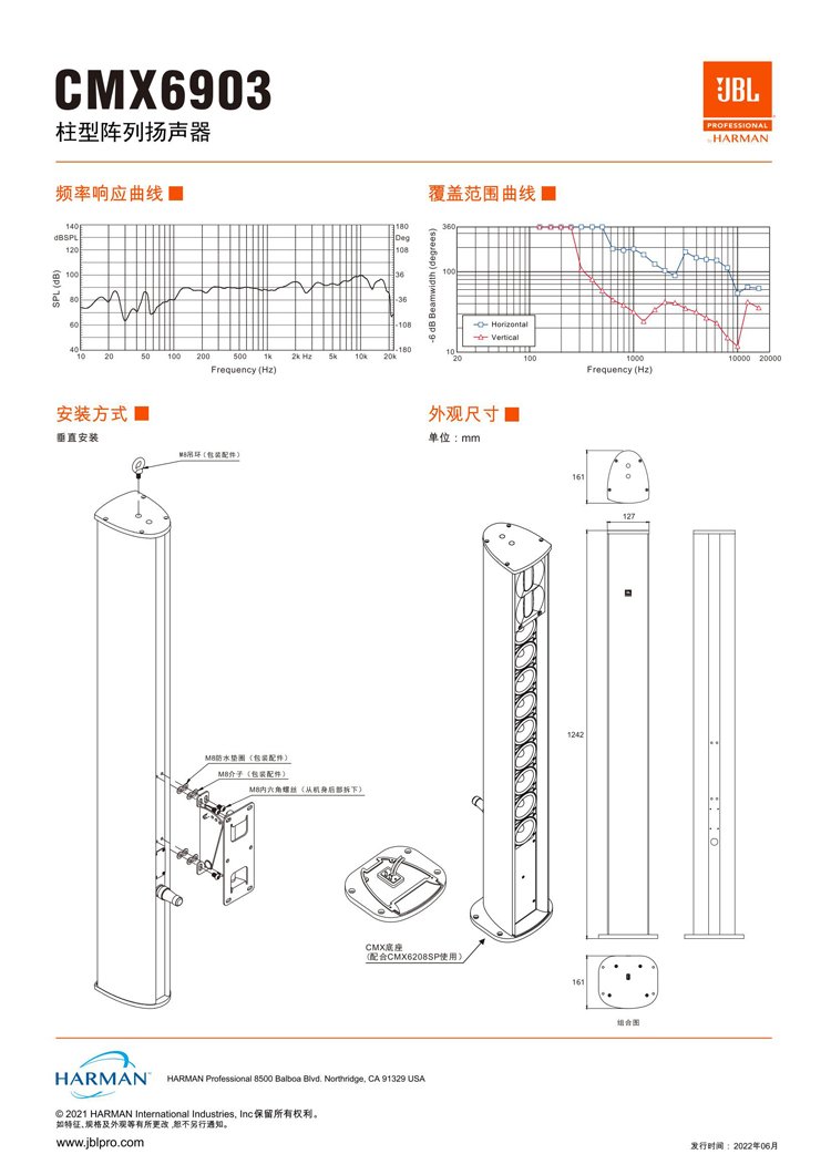 这款扬声器高 1242 毫米,是用于大屏幕演示的理想高度,屏幕两侧安装了一对 CMX6903 扬声器作为立体声扬声器