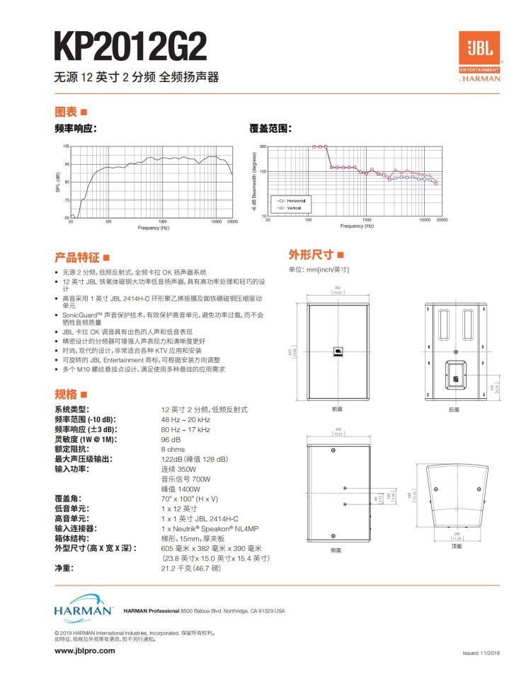 JBL KP2012G2 延续了 JBL Entertainment 在卡拉 OK 扬声器和音频性能方面的标志性传统,是一款适用于 KTV 应用和安装的youzhi 12 英寸无源、高输出、全频扬声器。该扬声器沿袭了其前身 KP2012 的脚步,因为它具有出色的人声和低音性能以及 JBL 的可靠性标准,采用重新构想的现代时尚设计。