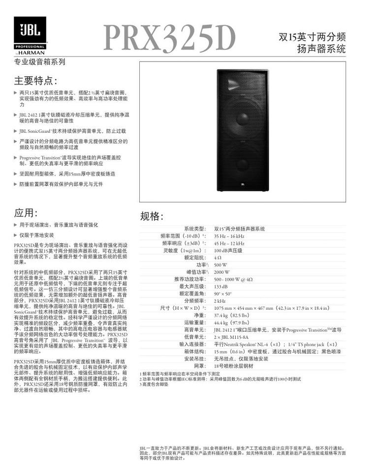 高音单元 | JBL 2412 1”喉口压缩单元,安装于Progressive TransitionTM波导 | ||