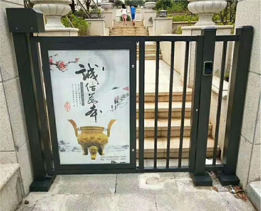 广告平推门分为自动和手动两种开门方式。一种新型的广告投放载体,将小区人行通道门与广告传播完美结合。其主要用于小区人行通道入口,小区内部通道,商业区人行通道,酒店过道等一切需要控制人流出入的场所。因其在传统的铁艺门上增加了独特广告灯箱,其夜间独特的灯光效果,不仅提升了小区出入口的高端形象,同时也为媒体广告信息的传播提供了更加丰富的选择,增加了社区业主与物业,广告主之间的信息桥梁,是现在及未来,小区物业配套设施的首要选择。