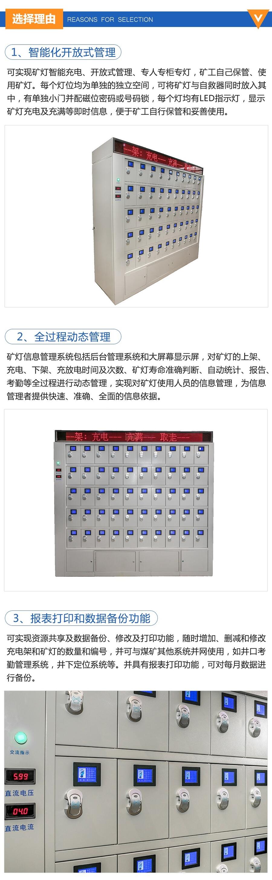 可实现矿灯智能充电、开方式管理、专人专柜专灯,矿工自己保管、使用矿灯。每个灯位均为单独的独立空间,可将矿灯与自救器同时放入其中,有单独小门并配磁位密码或号码锁,每个灯均有LED指示灯,显示矿灯充电及充满等即时信息,便于矿工自行保管和妥善使用。