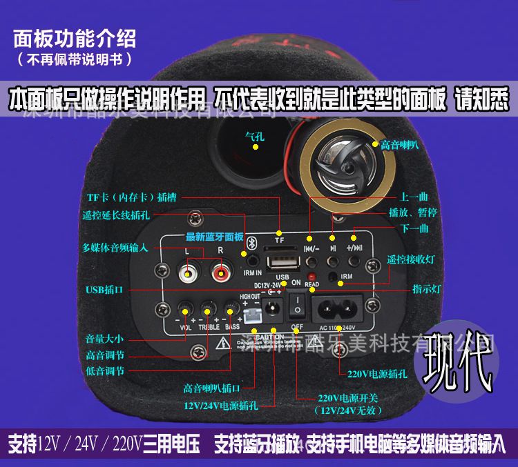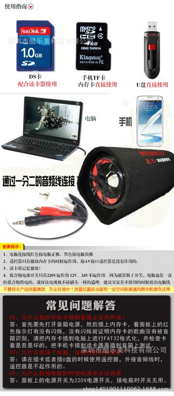 需要用手机蓝牙播放的童鞋请注意了:本店低音炮都支持蓝牙播放,如果需要实现蓝牙播放的功能,需要额外购买一个蓝牙适配器,插到音箱的usb口,才能实现这个功能!如果单买一个带蓝牙面板的低音炮回去,是实现不了蓝牙播放的!请各位知悉。