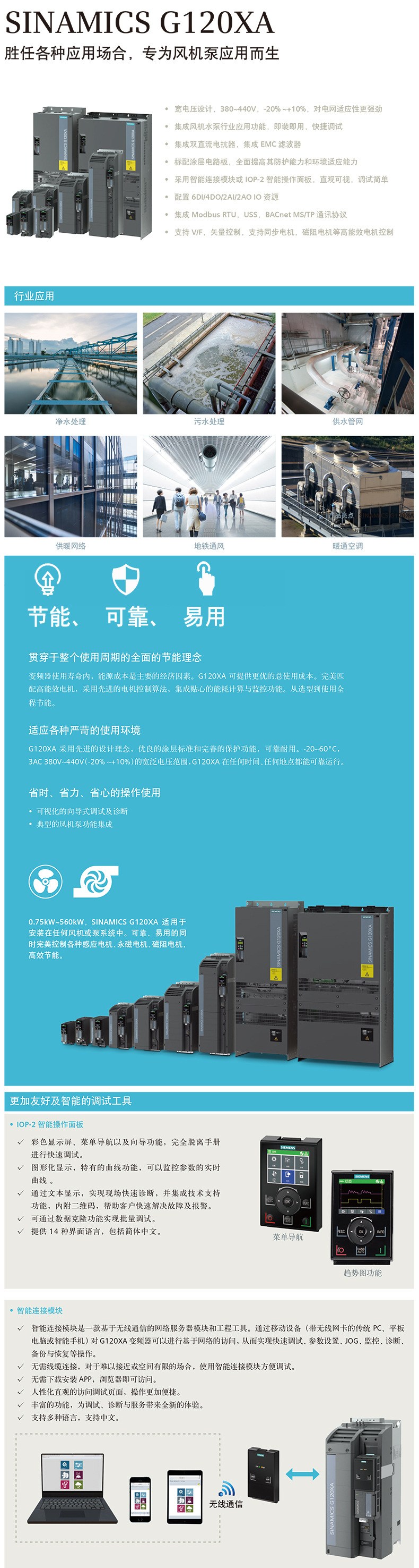 SINAMICS G120XA 额定功率 18.5kW 380 V -20% 至 440V + 10% 三相交流 未过滤 每 5 分钟 110% 50s 无操作面板 6DI,4DO,2AI,2AO,1Mot_t 最终开关设备 HxWxD:472x200x239