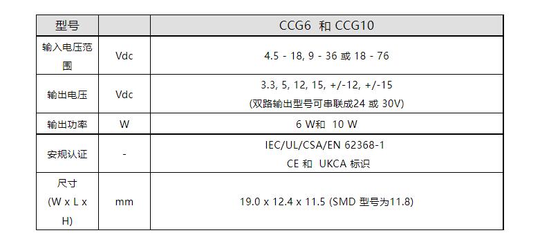 CCG6和CCG10系列包含36款不同电压和电流的型号,有3.3V, 5V, 12V, 15V单路输出,+/-12V 和 +/-15V双路输出。双路输出型号也可以配置为单路24V 和 30V输出。所有型号均可在4.5 - 18Vdc, 9 - 36Vdc 或18 - 76Vdc的输入范围内工作,可支持5V, 12V, 24V 和 48V DC输入。4:1的输入范围可以帮助减少库存计划和采购管理,每个型号可以涵盖两种标称输入电压。