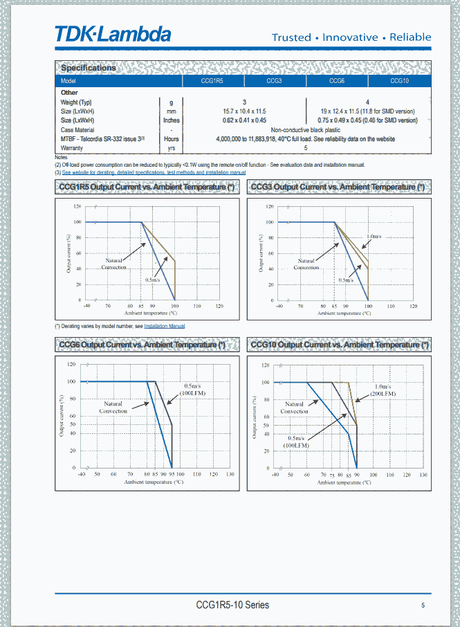 使用对流或强制风冷,CCG6工作温度范围为-40 至 +95 oC,CCG10工作温度范围为-40 至+90 oC。输入到输出隔离为1,500Vdc。产品通过IEC/UL/CSA/EN 62368-1安全标准认证,带有符合低电压和RoHS指令的CE 和 UKCA标识。