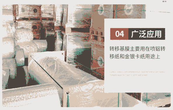 产品应用:转移基膜主要用在喷铝转移纸和金银卡纸用途上。
