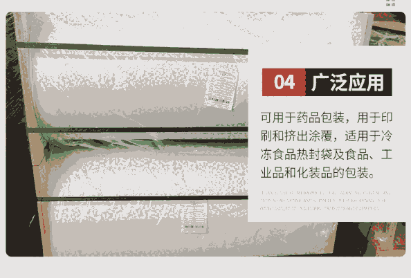 产品应用:可用于药品包装,用于印刷和挤出涂覆,适用于冷冻食品热封袋及食品、工业品和化装品的 包装。