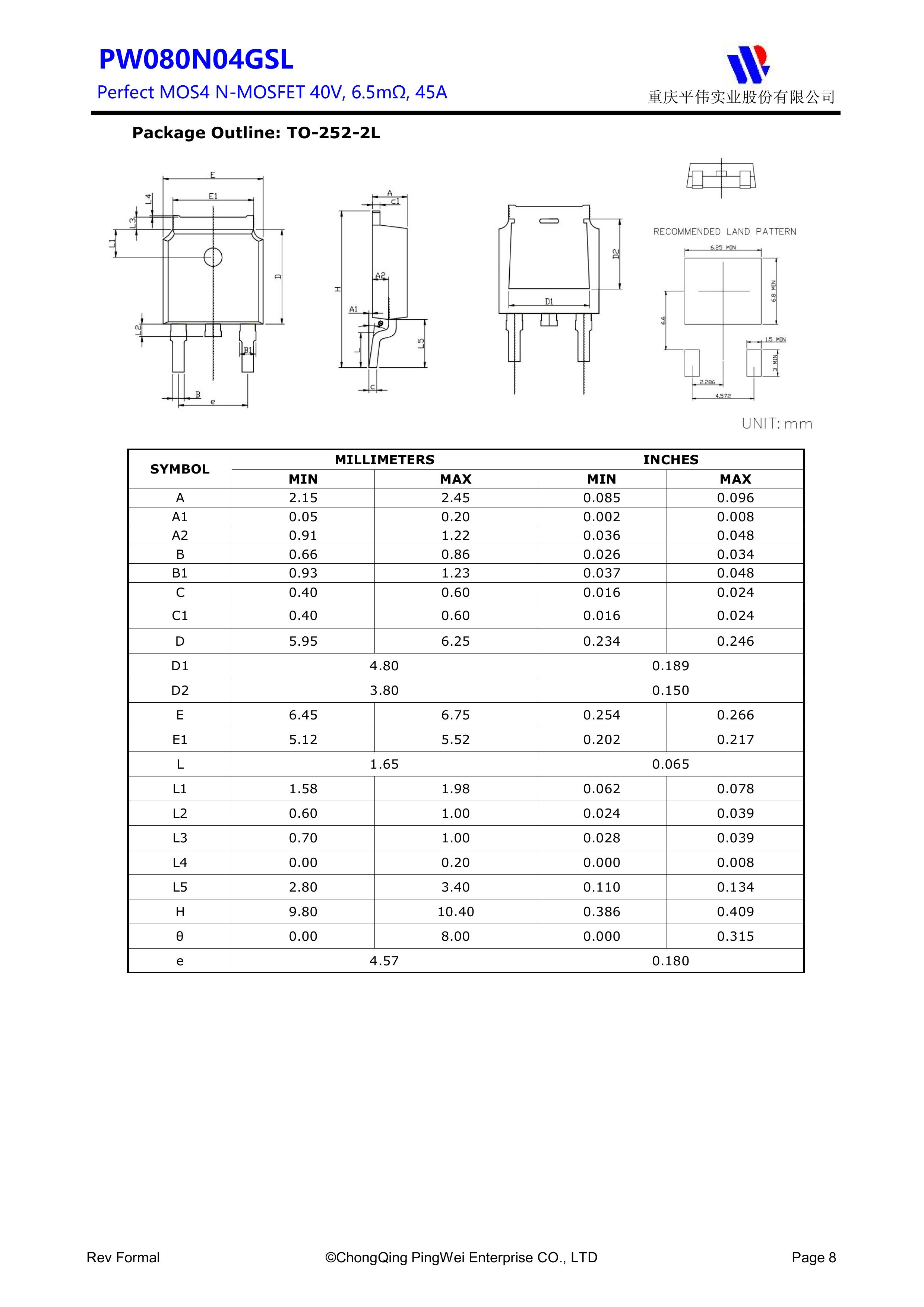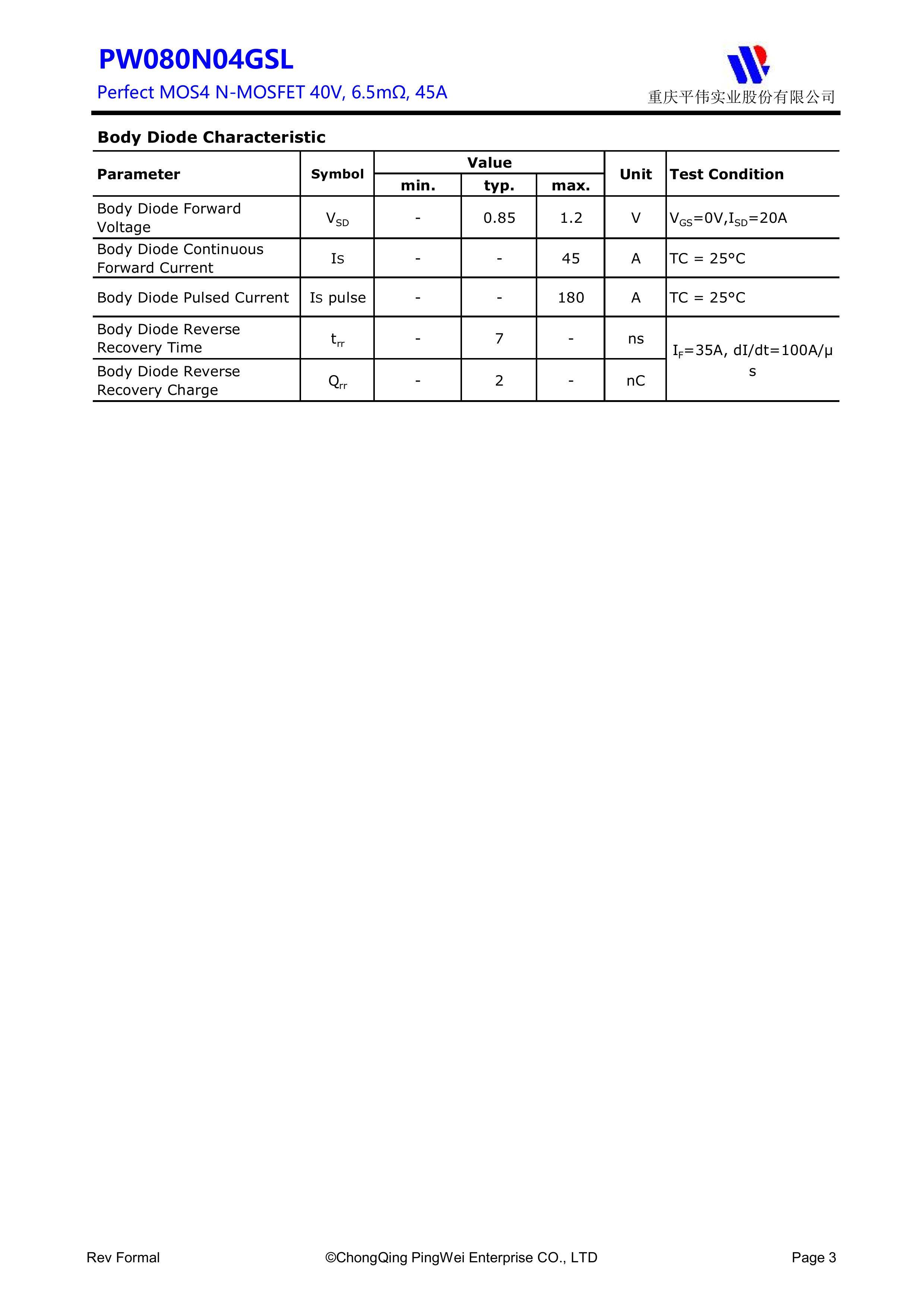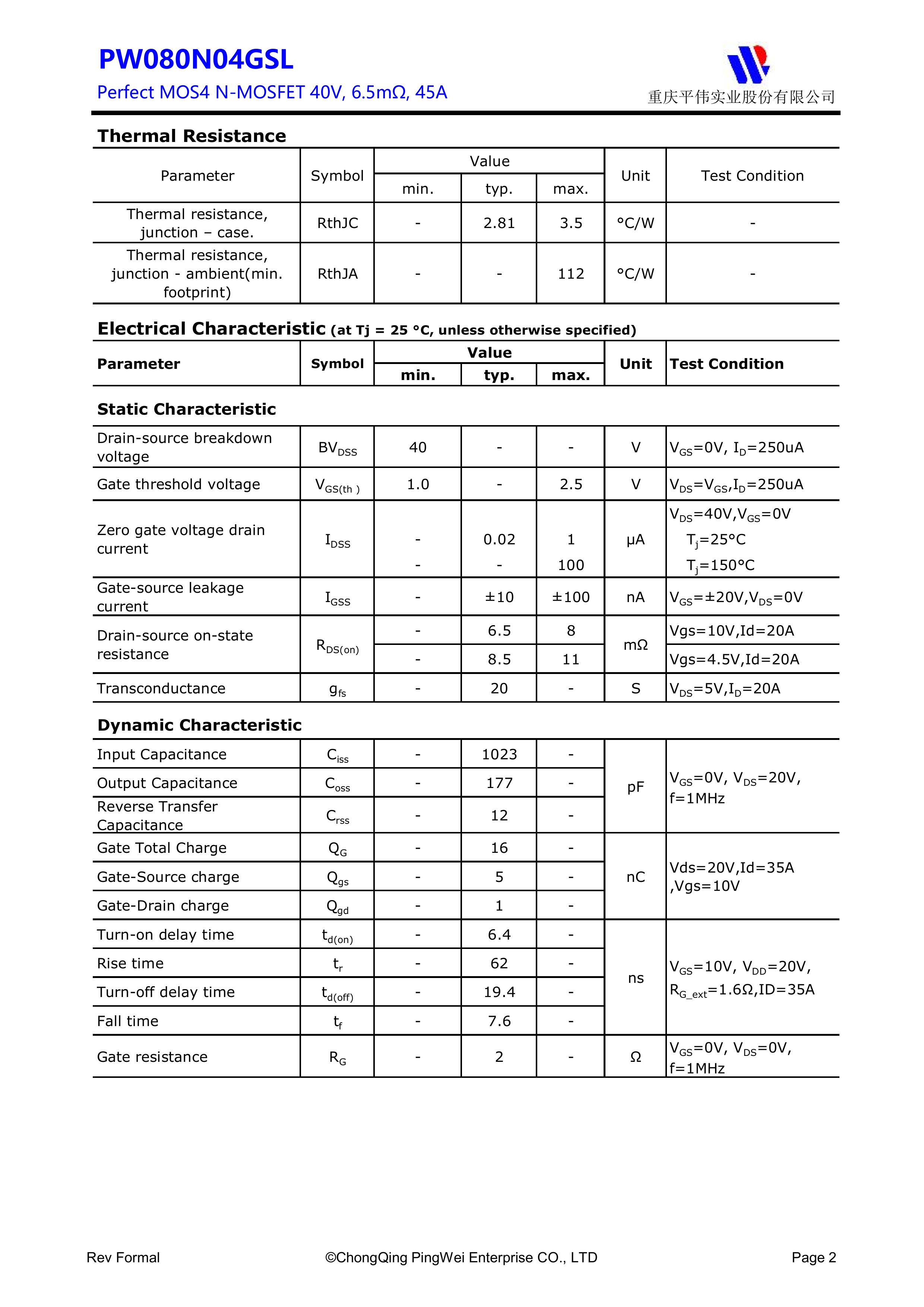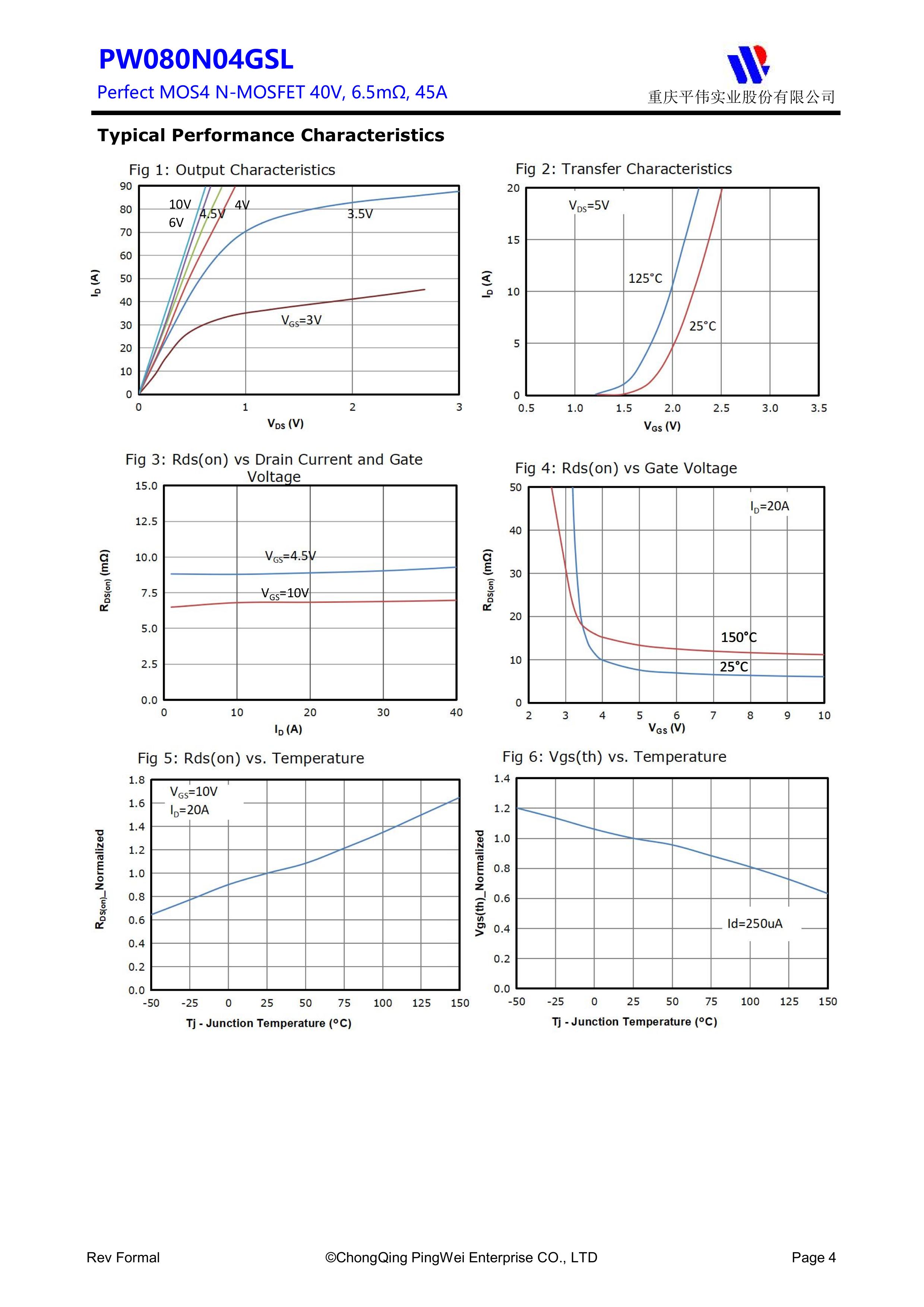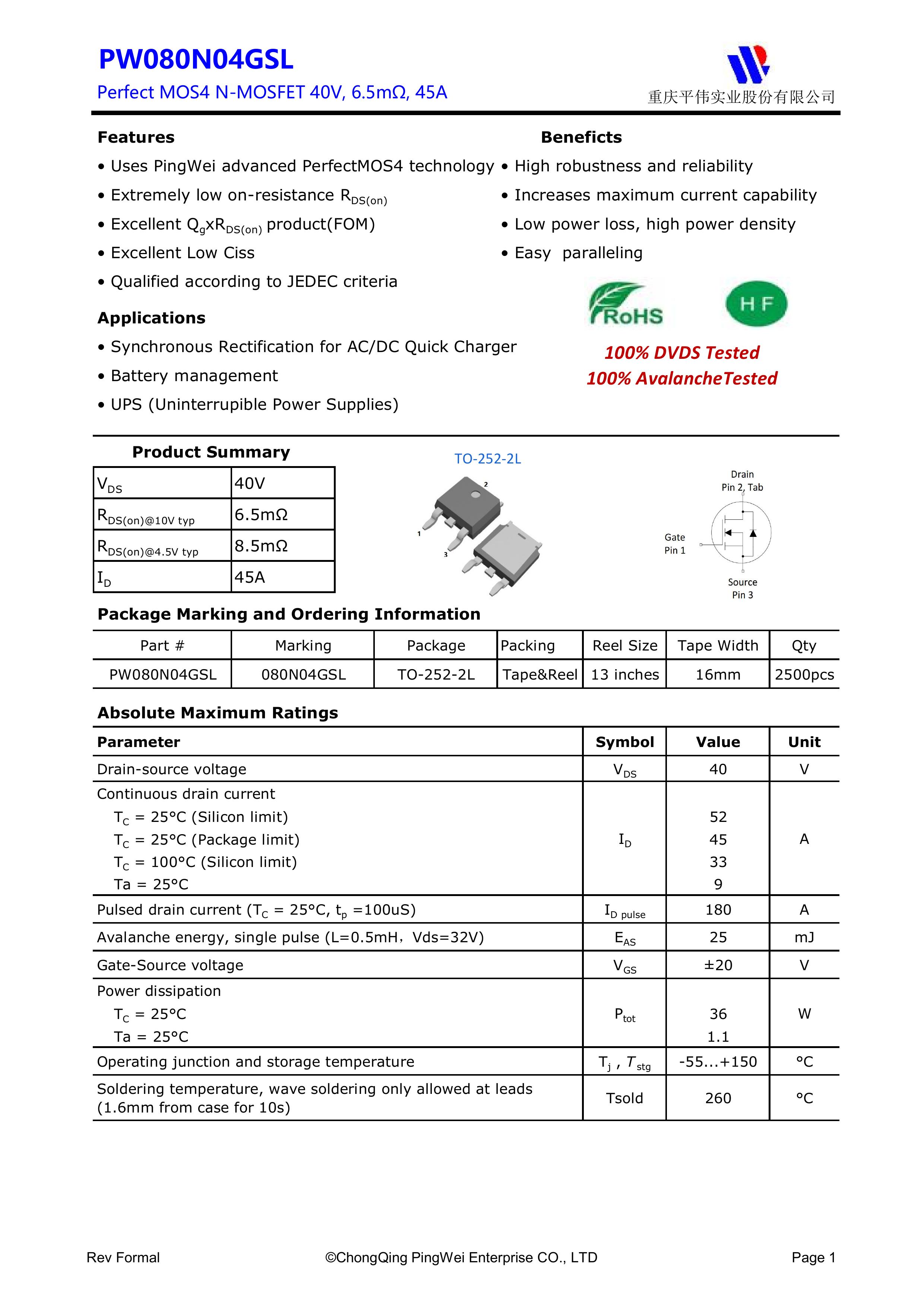PY/重庆平伟实业 PW080N04GSL 全新原厂原装中低压高频功率控制电子开关管,N型沟道场效应管40V、45A、6.5mΩ、N-Channel、贴片式中低压MOSFET:PW080N04GSL。Vds电压:40V;Id电流:45A;Rds(on)内阻:6.5mΩ;封装方式:TO-252-2L;最小包装数量:2500pcs/盘-编带。
