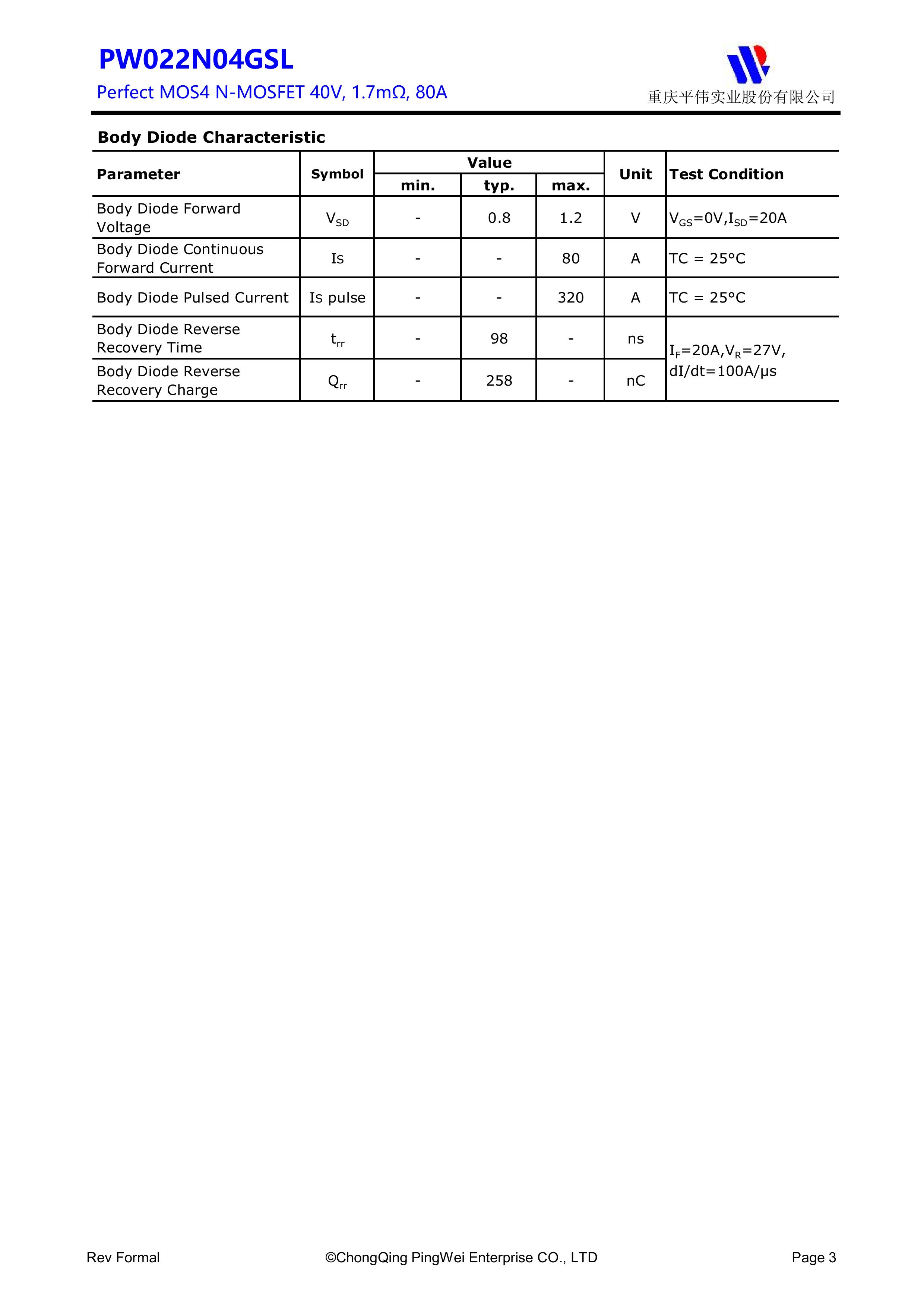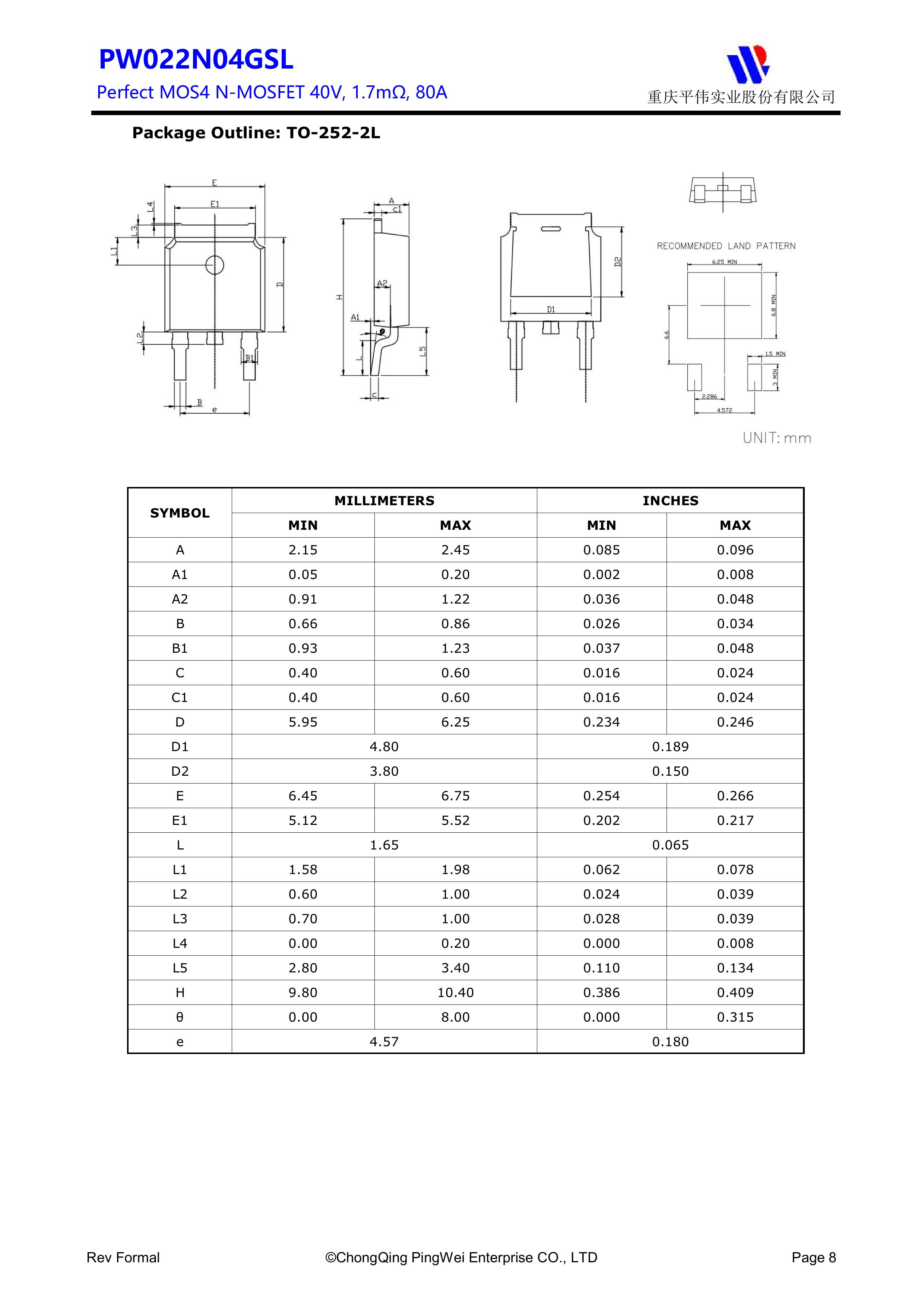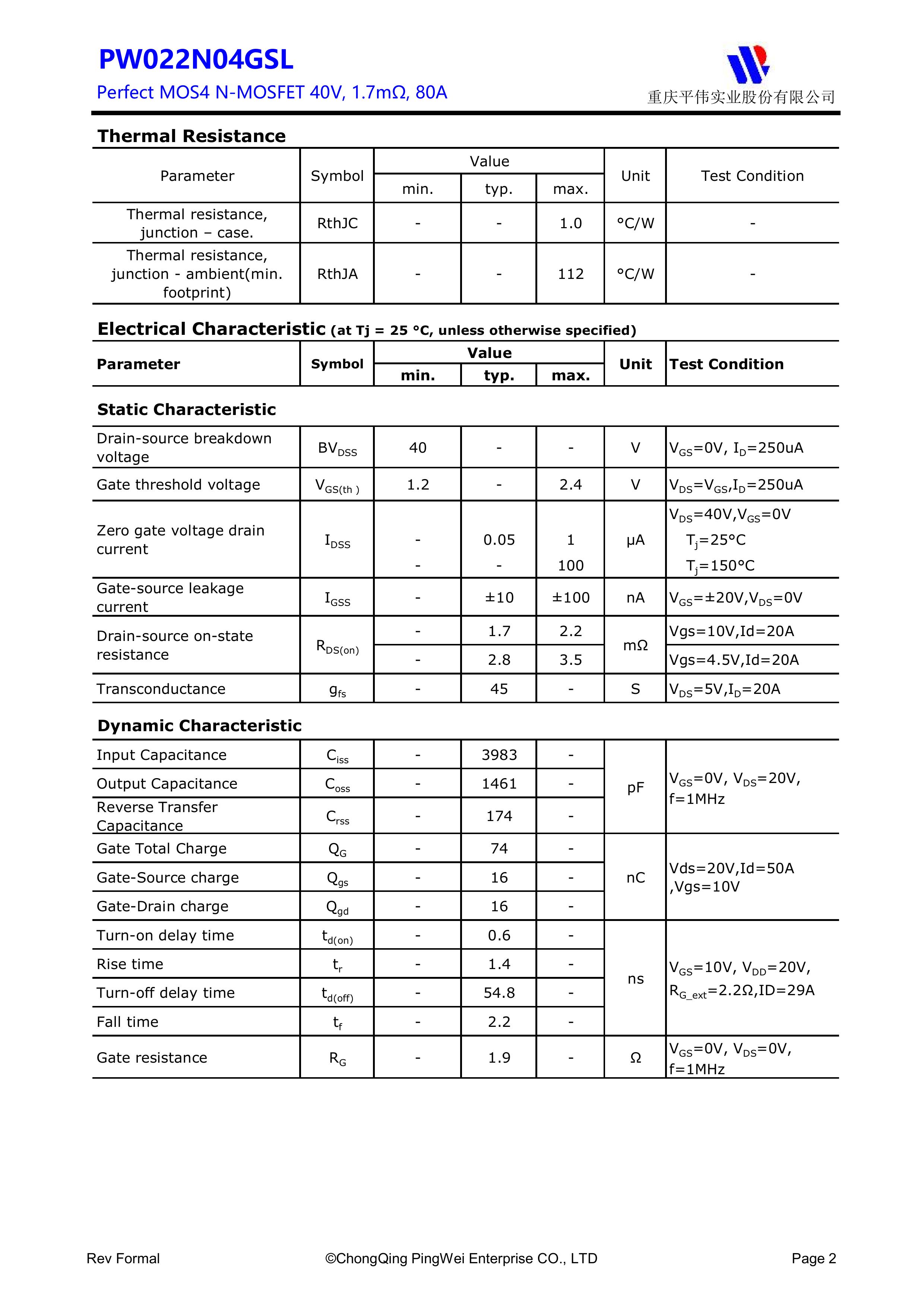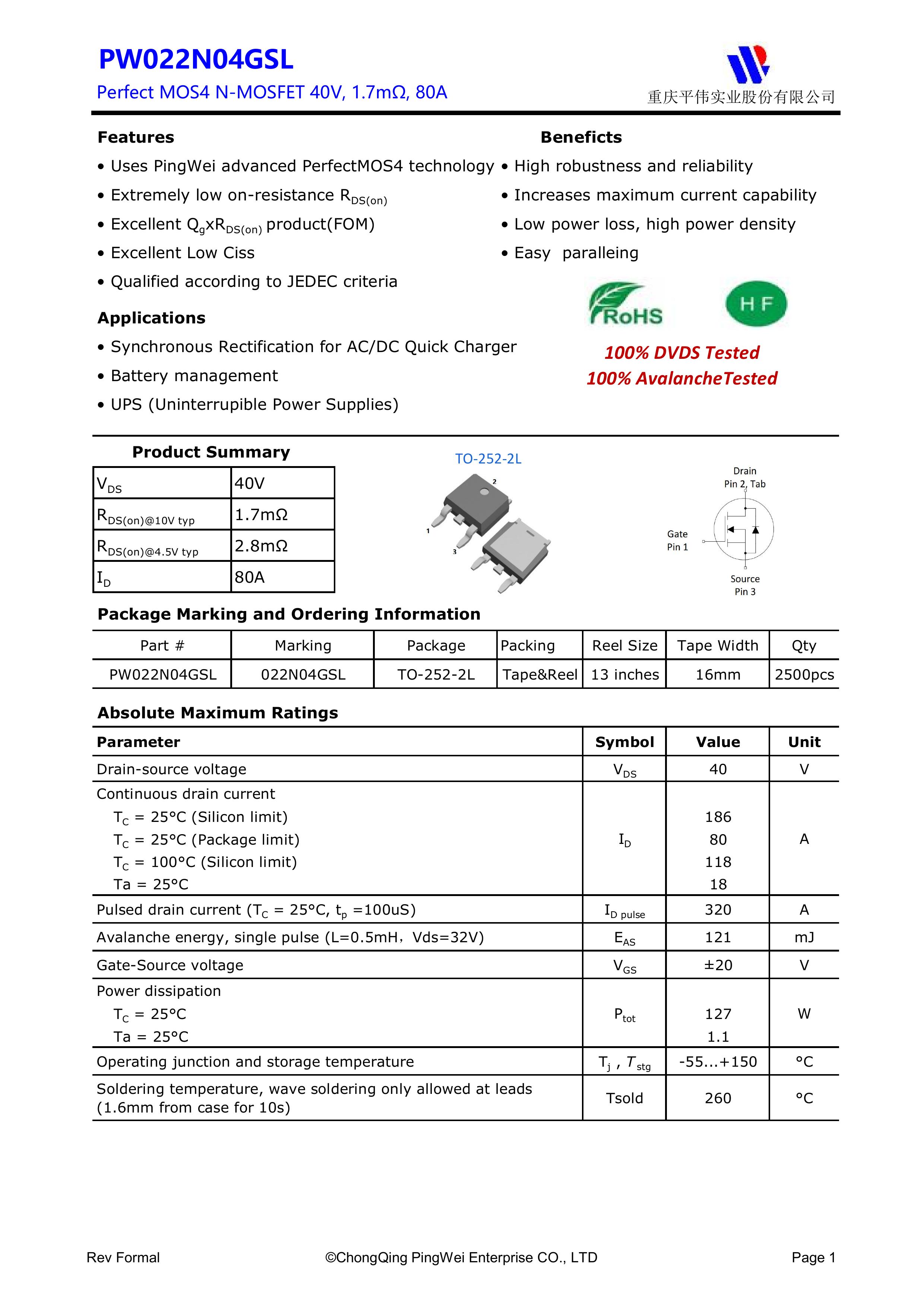 PY/重庆平伟实业 PW022N04GSL 全新原厂原装中低压高频功率控制电子开关管,N型沟道场效应管40V、80A、1.7mΩ、N-Channel、贴片式中低压MOSFET:PW022N04GSL。Vds电压:40V;Id电流:80A;Rds(on)内阻:1.7mΩ;封装方式:TO-252-2L;最小包装数量:2500pcs/盘-编带。