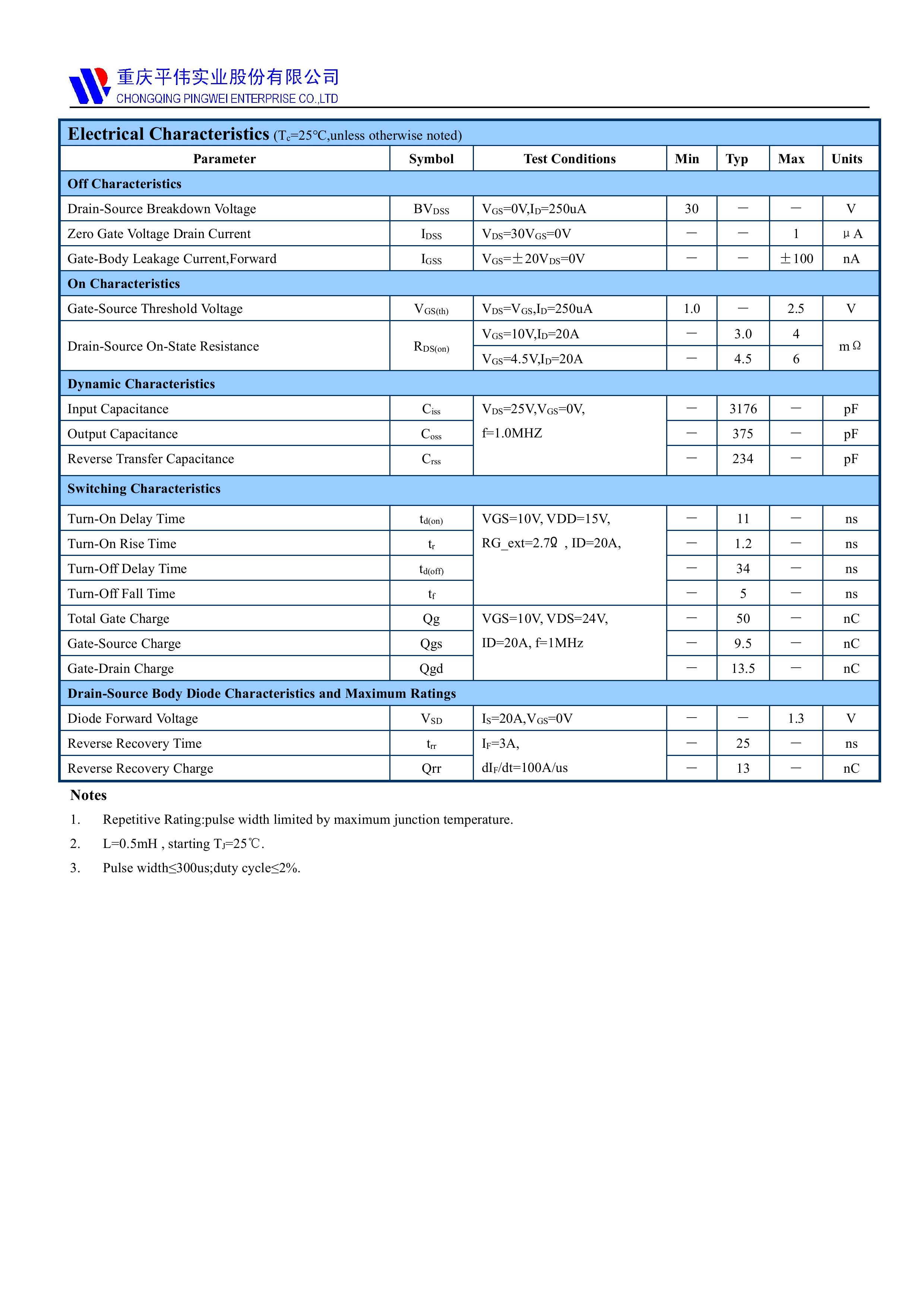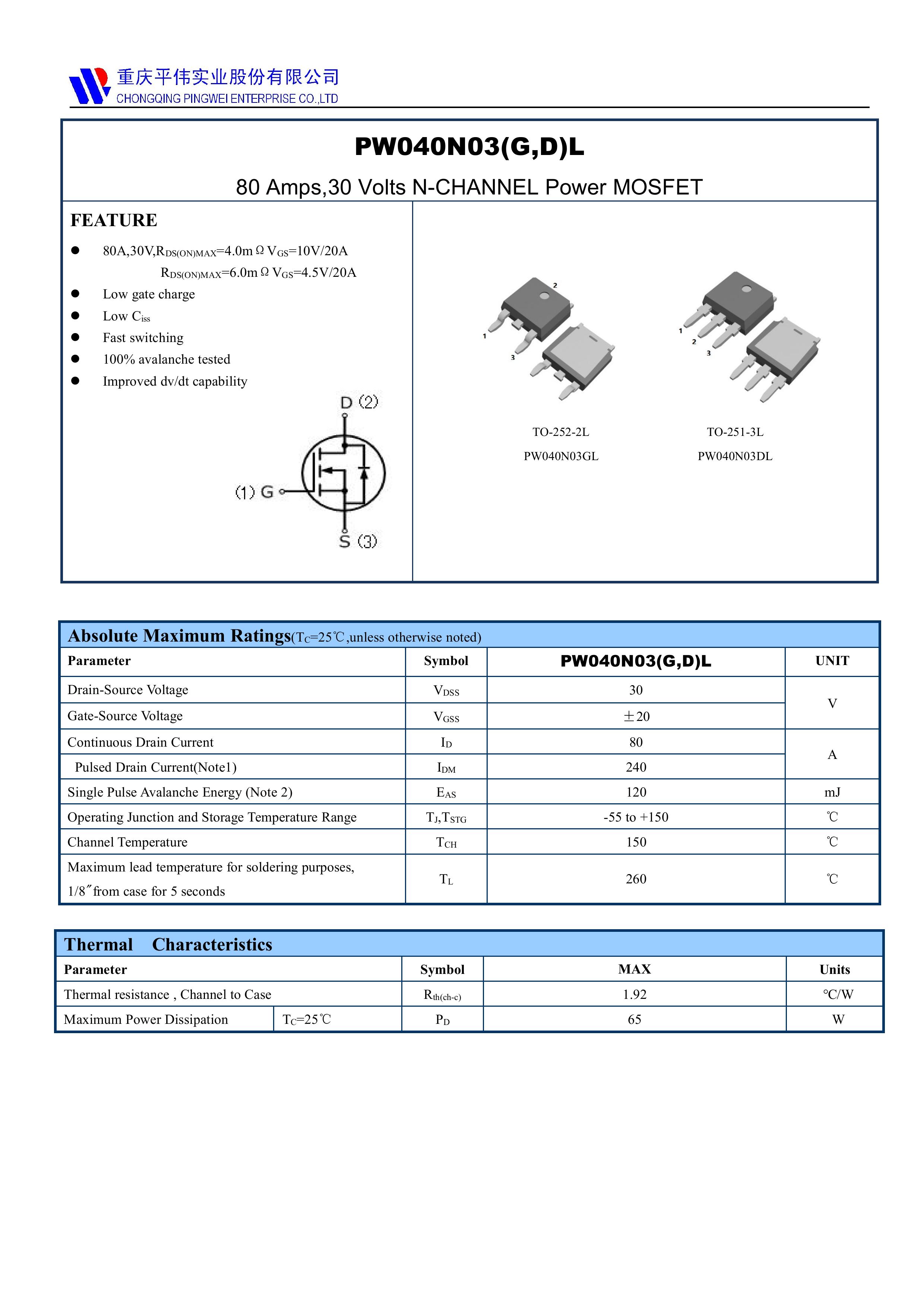 PY/重庆平伟实业 PW040N03GL 全新原厂原装中低压高频功率控制电子开关管,N型沟道场效应管30V、80A、3mΩ、N-Channel、贴片式中低压MOSFET:PW040N03GL。Vds电压:30V;Id电流:80A;Rds(on)内阻:3mΩ;封装方式:TO-252-2L;最小包装数量:2500pcs/盘-编带。