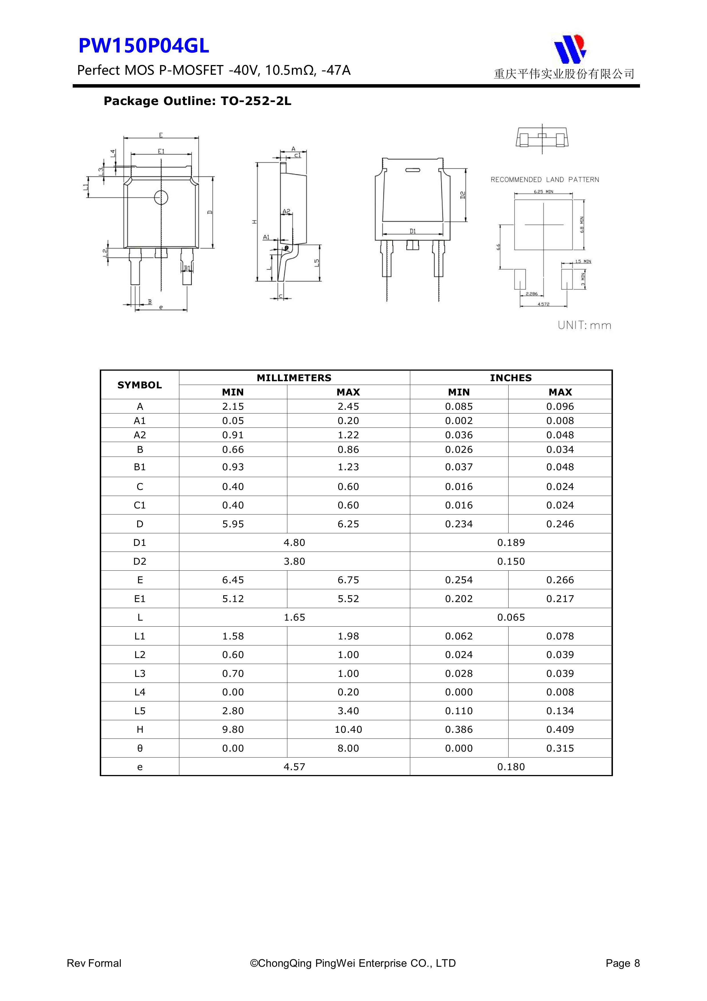 PY/重庆平伟实业 PW150P04GL 全新原厂原装中低压高频功率控制电子开关管,P型沟道场效应管-40V、-47A、10.5mΩ、P-Channel、贴片式中低压MOSFET:PW150P04GL。Vds电压:-40V;Id电流:-47A;Rds(on)内阻:10.5mΩ;封装方式:TO-252-2L;最小包装数量:2500pcs/盘-编带。