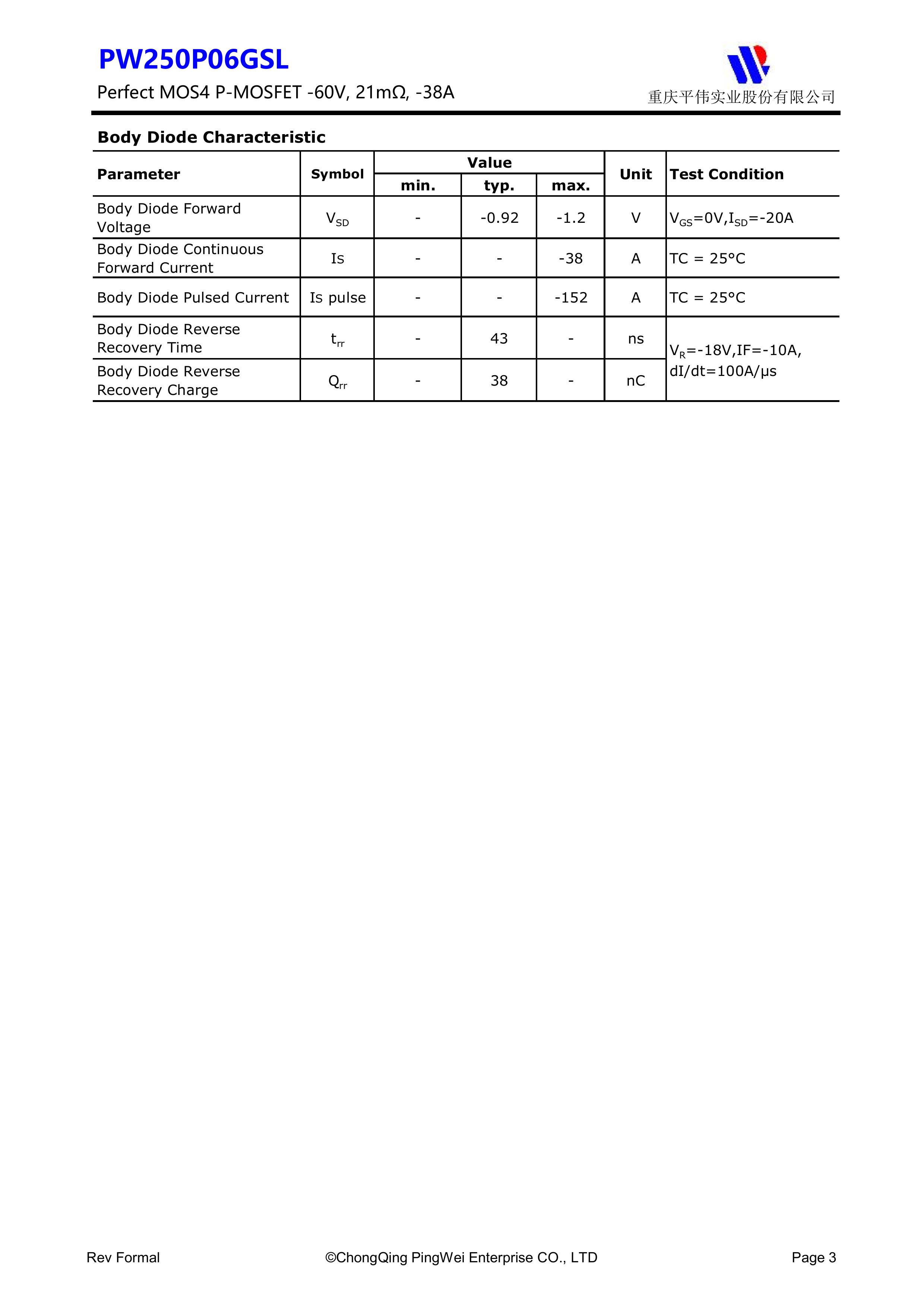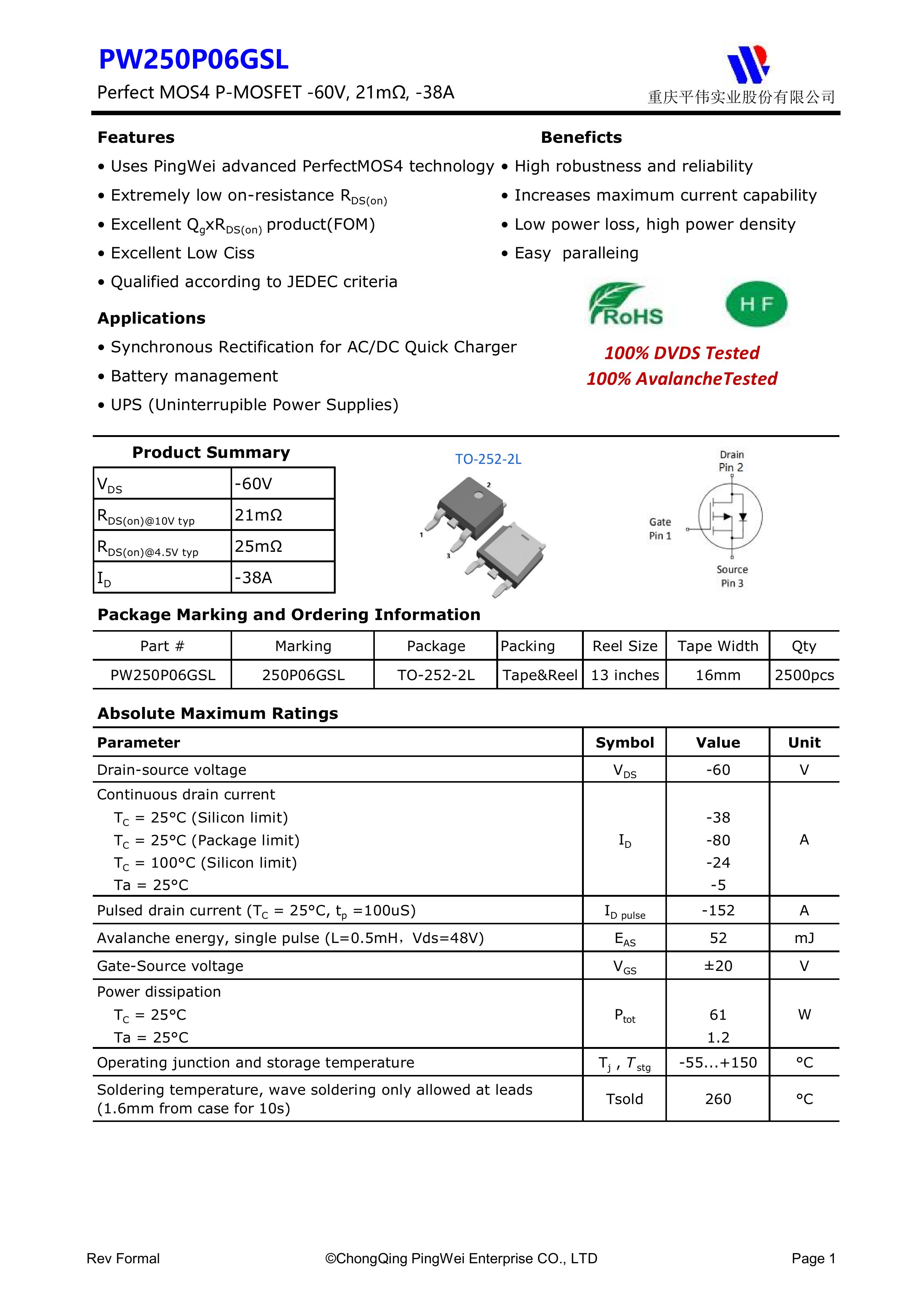 PY/重庆平伟实业 PW250P06GSL 全新原厂原装中低压高频功率控制电子开关管,P型沟道场效应管-60V、-38A、21mΩ、P-Channel、贴片式中低压MOSFET:PW250P06GSL。Vds电压:-60V;Id电流:-38A;Rds(on)内阻:21mΩ;封装方式:TO-252-2L;最小包装数量:2500pcs/盘-编带。