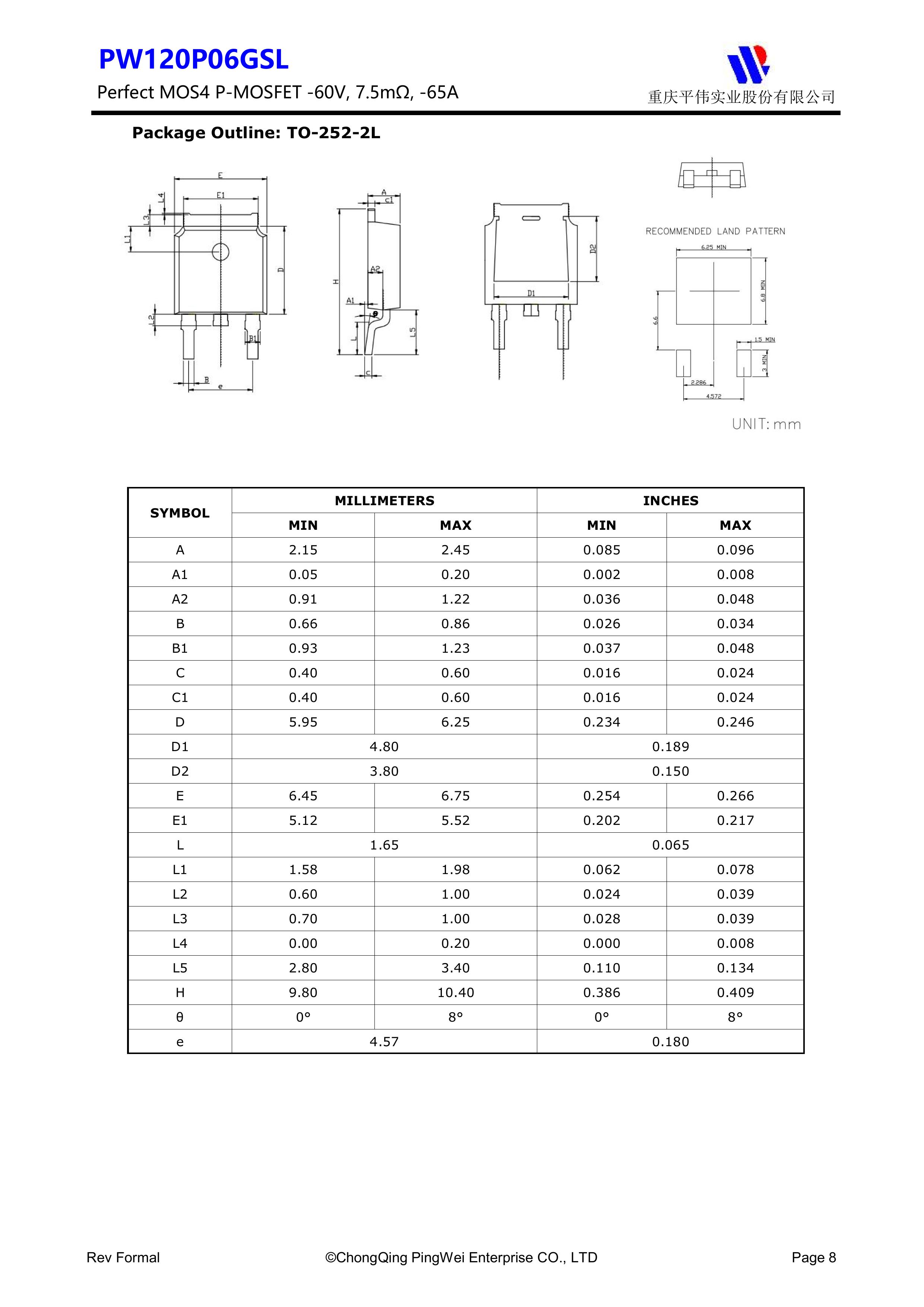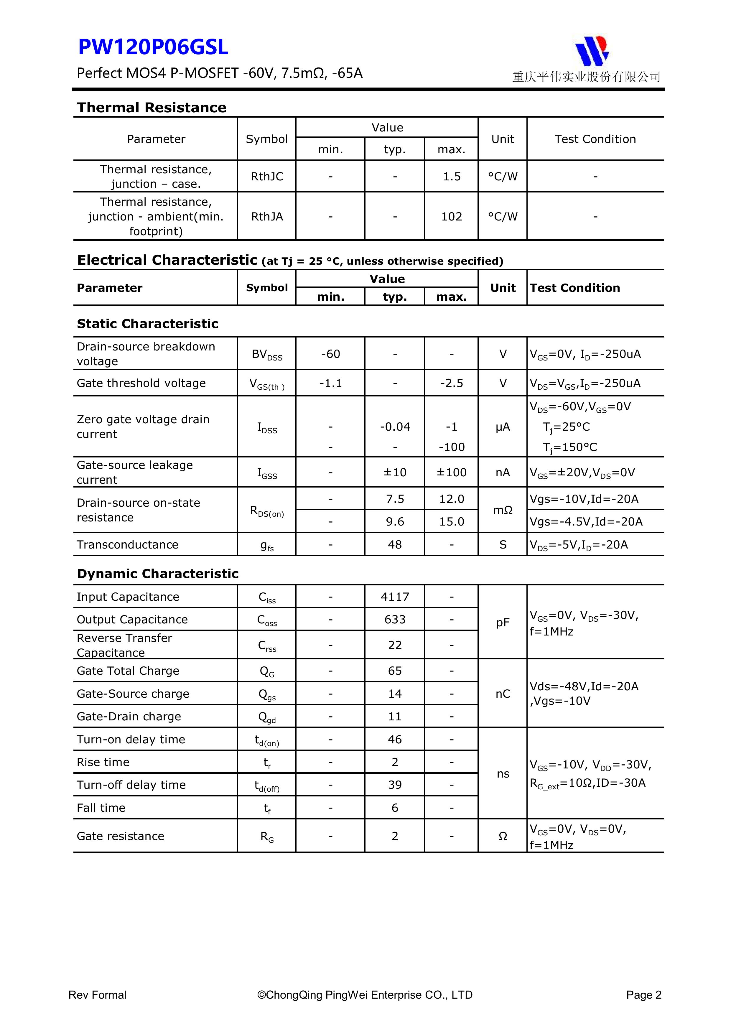 PY/重庆平伟实业 PW120P06GSL 全新原厂原装中低压高频功率控制电子开关管,P型沟道场效应管-60V、-65A、7.5mΩ、P-Channel、贴片式中低压MOSFET:PW120P06GSL。Vds电压:-60V;Id电流:-65A;Rds(on)内阻:7.5mΩ;封装方式:TO-252-2L;最小包装数量:2500pcs/盘-编带。