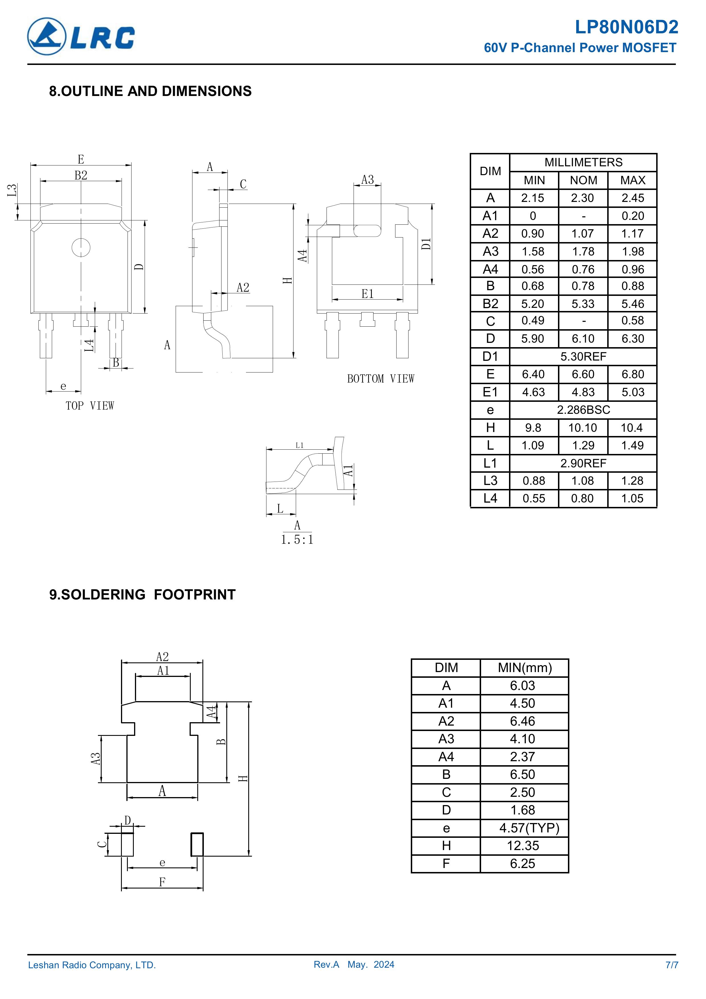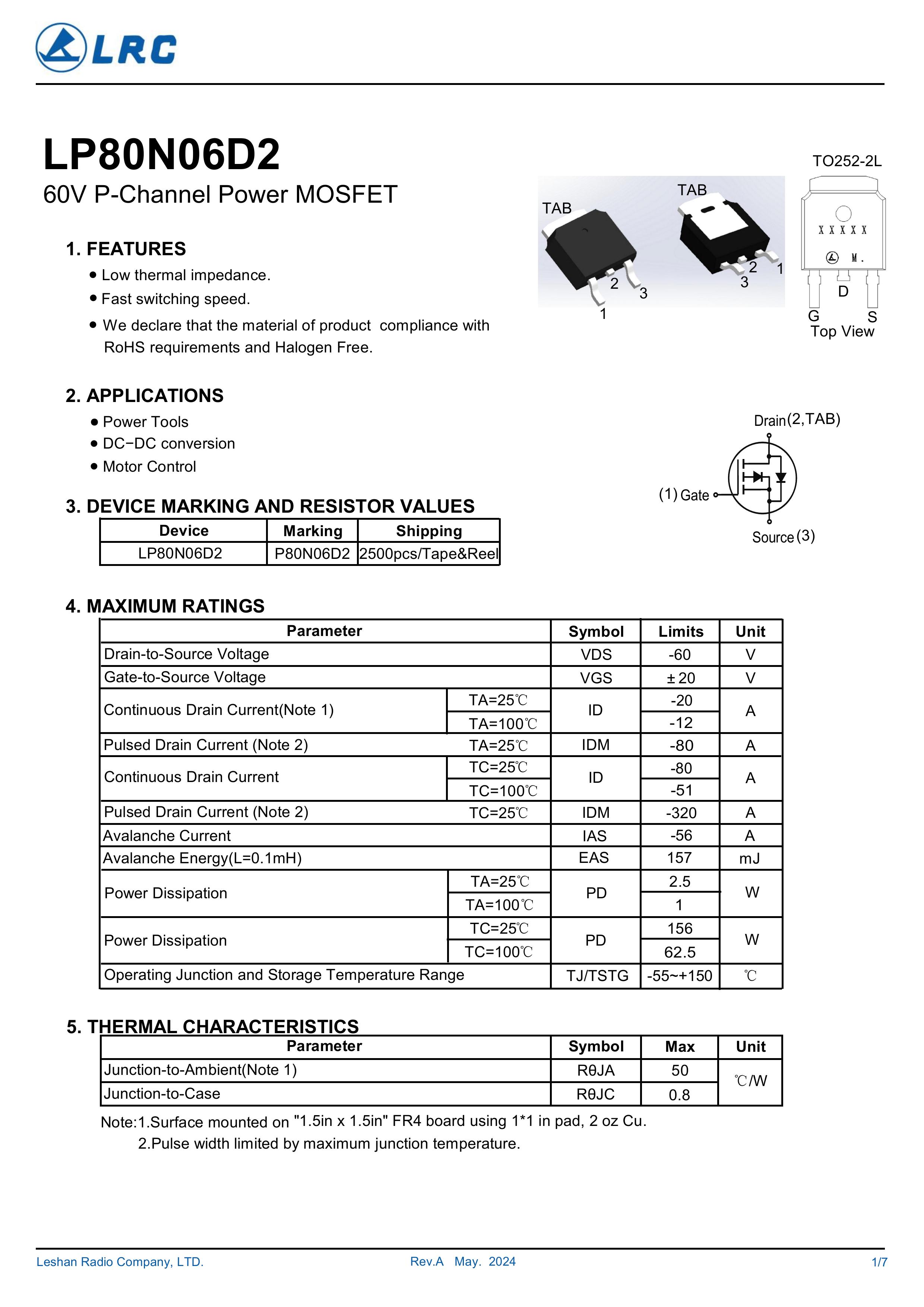 LRC/乐山无线电 LP80N06D2 全新原厂原装中低压高频功率控制电子开关管,P型沟道场效应管-60V、-59A、9.8mΩ、P-Channel、贴片式中低压MOSFET:LP80N06D2/P80N06D2。Vds电压:-60V;Id电流:-59A;Rds(on)内阻:9.8mΩ;封装方式:TO-252-2L;最小包装数量:2500pcs/盘-编带。