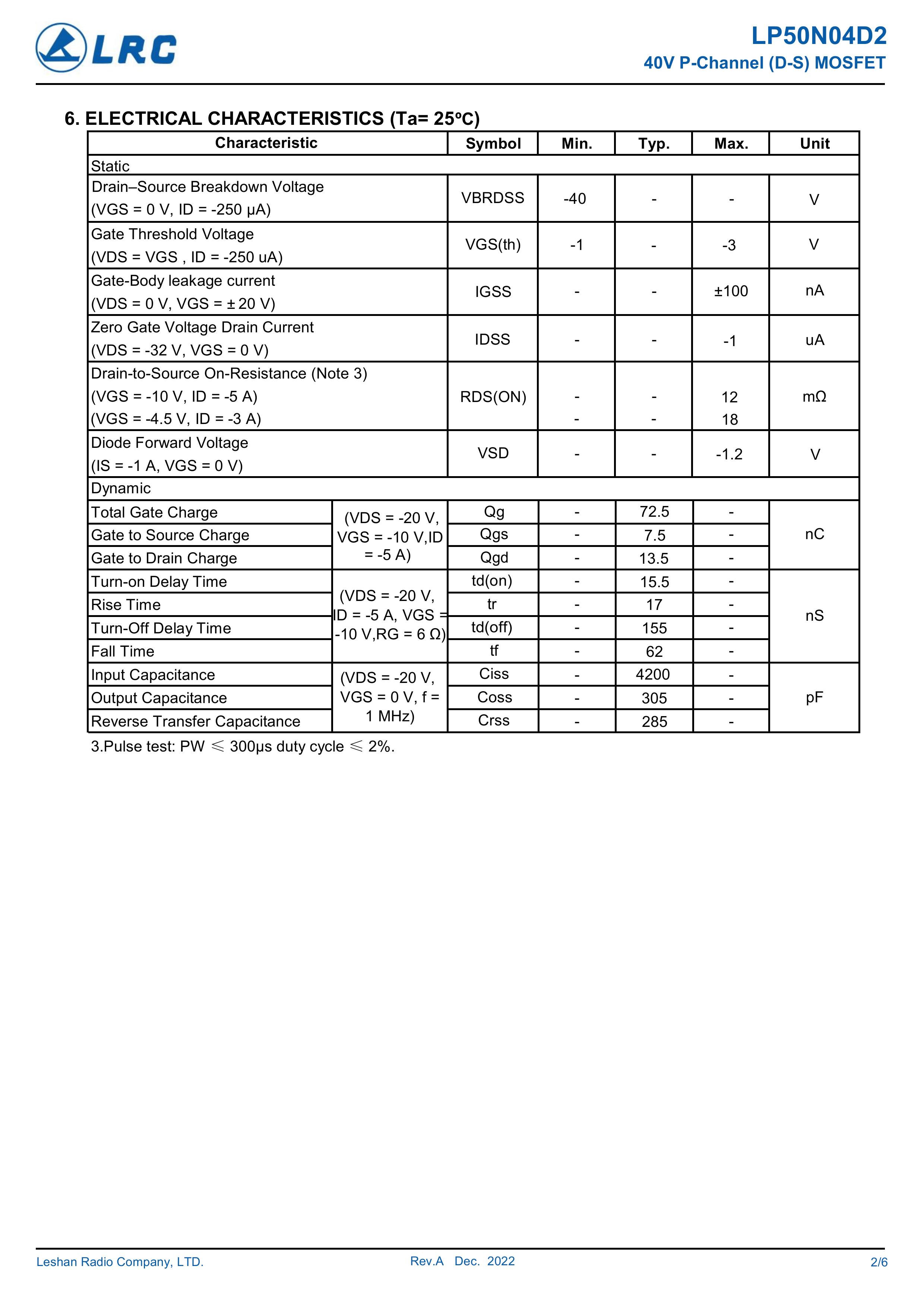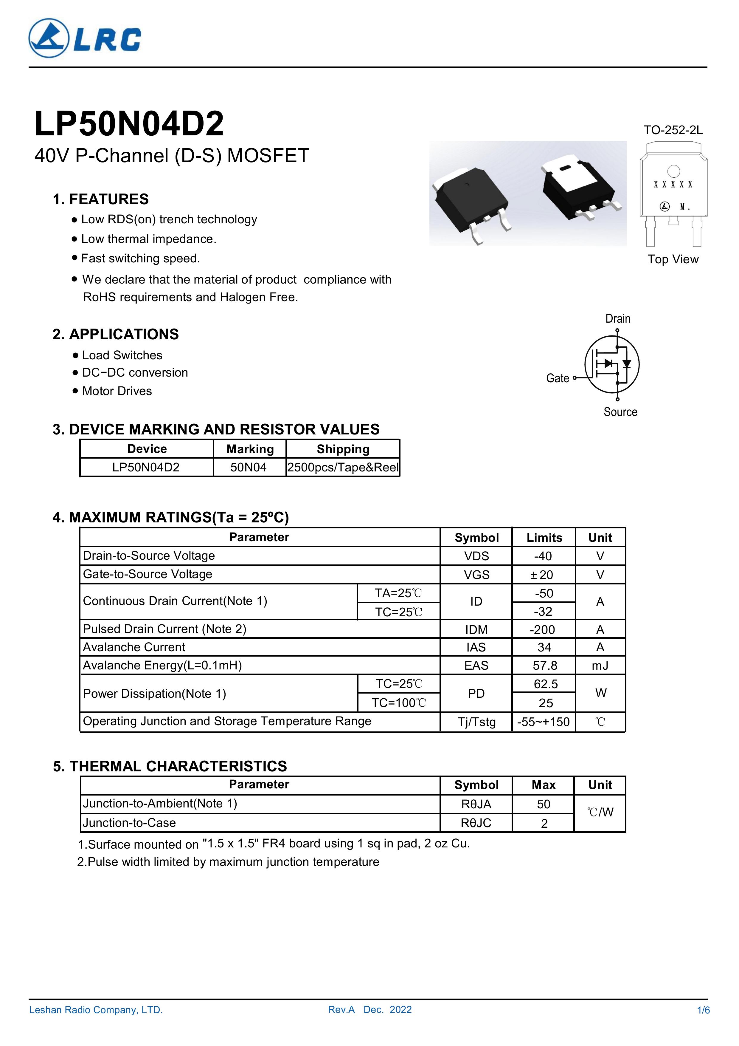 LRC/乐山无线电 LP50N04D2 全新原厂原装中低压高频功率控制电子开关管,P型沟道场效应管-40V、-50A、12mΩ、P-Channel、贴片式中低压MOSFET:LP50N04D2/50N04。Vds电压:-40V;Id电流:-50A;Rds(on)内阻:12mΩ;封装方式:TO-252-2L;最小包装数量:2500pcs/盘-编带。