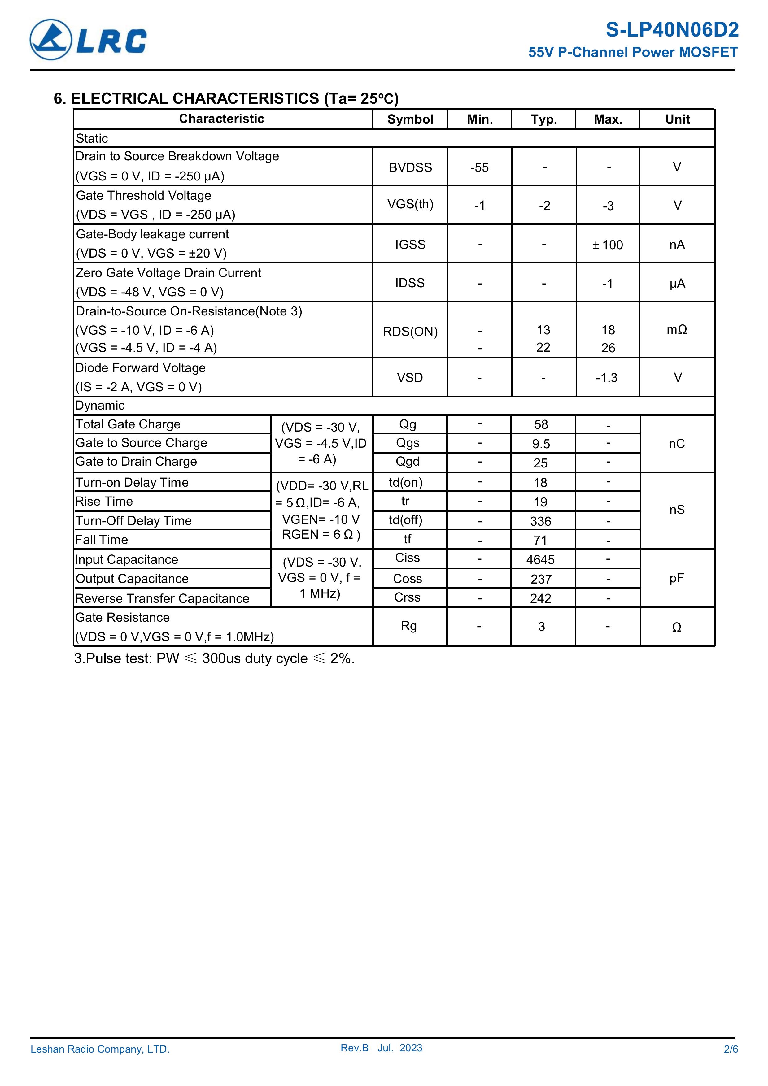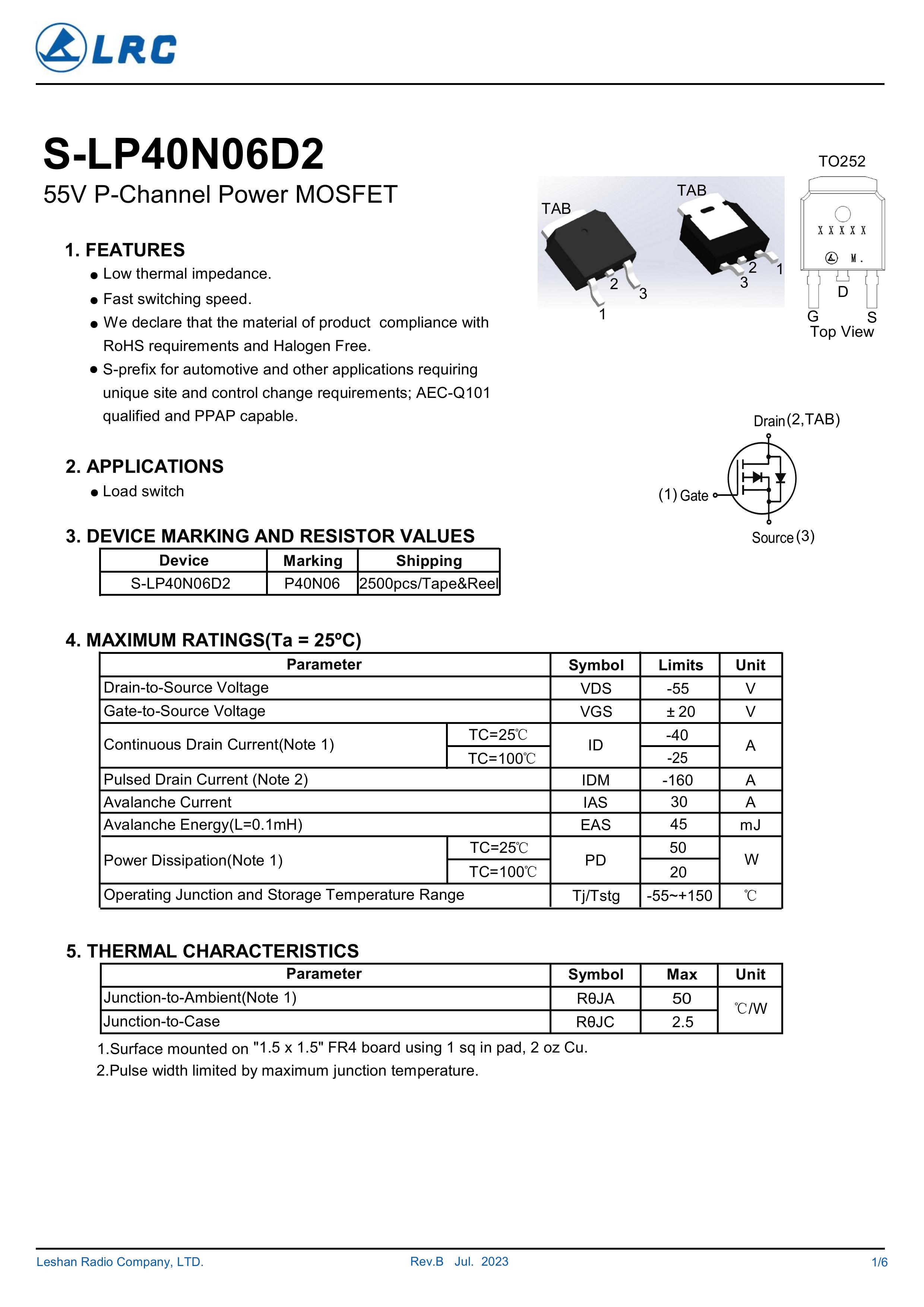 LRC/乐山无线电 S-LP40N06D2 全新原厂原装中低压高频功率控制电子开关管,车规级P型沟道场效应管-55V、-40A、13mΩ、P-Channel、贴片式中低压MOSFET:S-LP40N06D2/P40N06。Vds电压:-55V;Id电流:-40A;Rds(on)内阻:13mΩ;封装方式:TO-252-2L;最小包装数量:2500pcs/盘-编带。