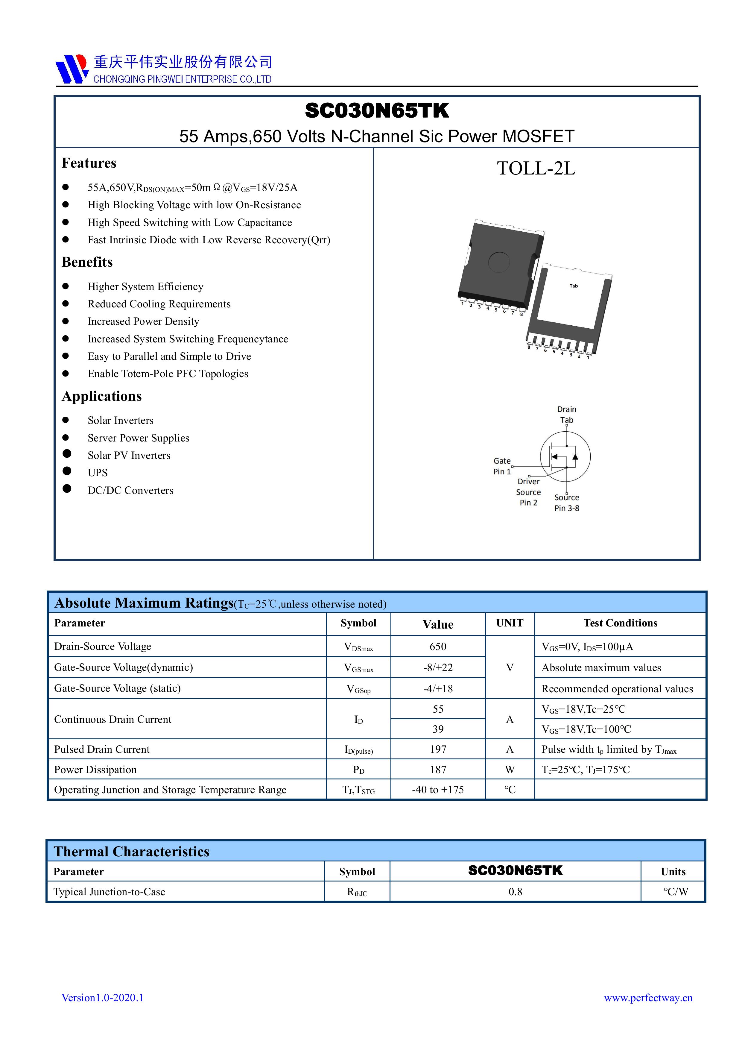 SC030N65TK 碳化硅大芯片高电压大电流低内阻低漏电的分立式功率整流晶体开关管。本品采用内置大尺寸芯片,源极7脚位支持多路输出贴片式封装,,具有适应高电压低内阻损耗高频高效恢复快等电气特性特点。通用于电源、小家电、锂电池、马达电机、电动工具、无人机、电器、适配器、充电器、逆变器、充电桩、特种电源、高频电源、风光储新能源、医疗设备、工业工控等产品电路作电子开关、控制、整流、放大、钳位、防反接、防逆回流等作用。