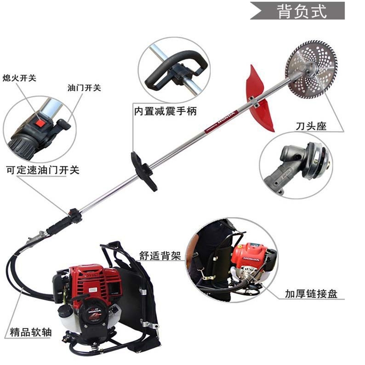 割草机又称除草机、剪草机、草坪修剪机等。割草机是一种用于修剪草坪、植被等的机械工具,它是由刀盘、发动机、行走轮、行走机构、刀片、扶手及控制部分组成。由平行四杆升降装置,机架、左右单翼锄草装置,整机调偏装置,梳齿旋转圆锥齿轮增速传动机构和梳齿仿型调深装置组成;效率人工锄草提高8至10倍,伤苗率低,除苗清洁率高。 轻便背负式除草机: