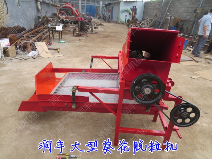 油葵脱粒机葵花脱粒机配合动力5.5KW以上电动机,柴油机,拖拉机,可与小四轮后尾轮连接,三轮车,等等。本品使用农机,用于葵花脱粒,改变了多年来手工作业的状况方便快捷。结构,使用方便,脱净率高,不裹粒,分离彻底,作业方便,不损伤籽粒的光亮度,生产效率高,适合长时间作业,每小时可脱粒800-1000千克。