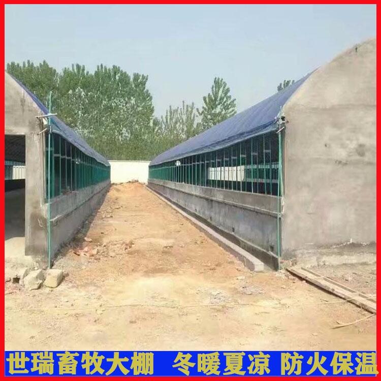 现将以适于小型规模饲养场或养殖大户使用的单列式牛棚为例,牛棚以东西走向为主,在西墙是部留门(1mX1.75m),供人员、清粪车出入。冬季东北风多,留西门便于保温。牛棚南北跨度6.5m,是面用砖砌高40cm的墙并留有活动式进气也数个,是墙向里2.5m处架高为2.5m的是梁,在后墙处架高为2m的后梁,不砌后墙,是后梁之间用棚檩和苇板连接固定。在东西山墙棚顶下方20cm处留活动式出气孔(20cmX20cm)各2个,畜床宽为4m,牛头南尾北。从是梁到是墙用棚杆连接,外用活动式棉帘、暖膜及水笼布覆盖,并注意压实,以防暖膜被风吹起损坏,后墙只用棉帘和水笼布挂在后梁上即可。牛棚长度根据以馒头牛数量而定,以每头牛长1.5m为宜。
