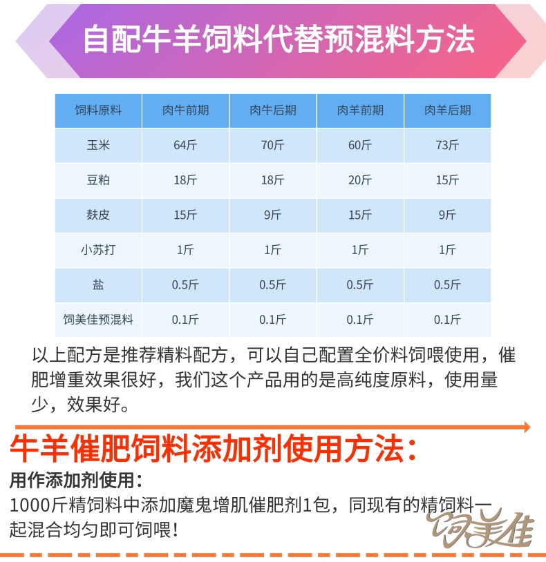 饲美佳是我们2019年注册的商标,我们主要就是做牛羊催肥剂,秸秆分解剂,秸秆发酵剂,牛羊催肥小料产品等:近几年开发的饲美佳系列牛羊催肥剂产品,1000斤精料需要1斤饲美佳魔鬼催肥剂,价格35元,并且不含违禁成分,绿色健康的催肥剂产品。