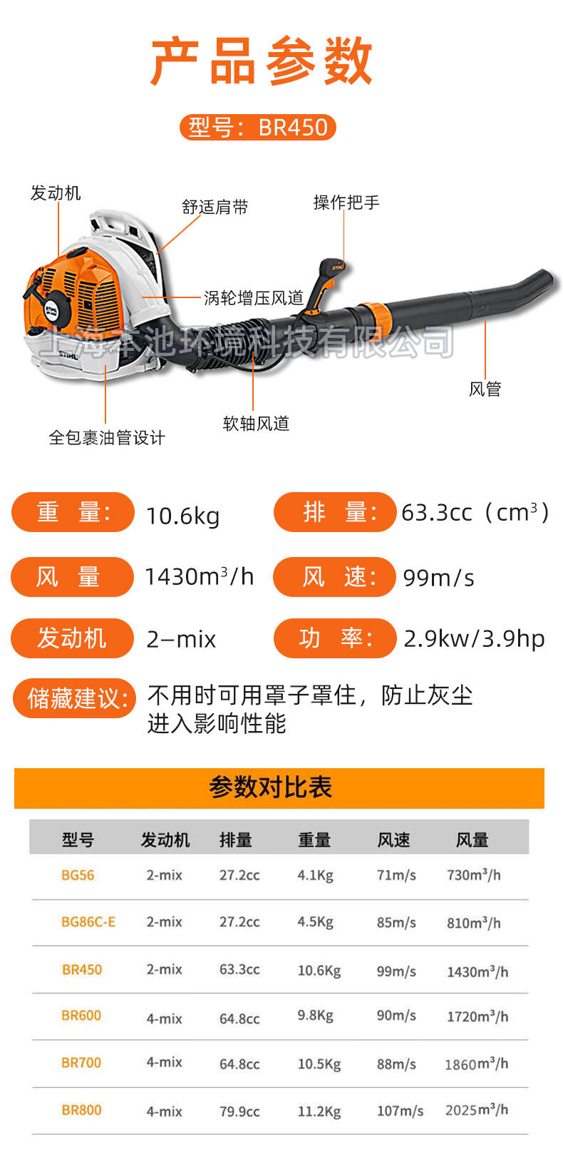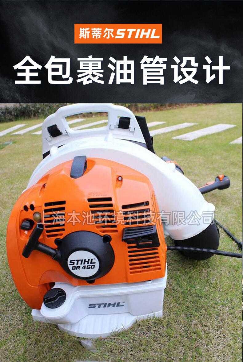 STIHL斯蒂尔BR450背负式吹风机,森林消防灭火机,2.9KW大功率,加厚肩带,久背不累。吹力强,涡轮式动力风扇技术。多功能把手,发动机控制装置的操作原件都集成在该把手中。因此操作简单安全。可用于大棚除雪、清理落叶、风力灭火等等。全包裹油管设计,防治油管被割破漏油。