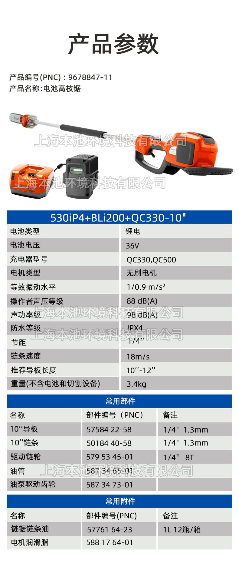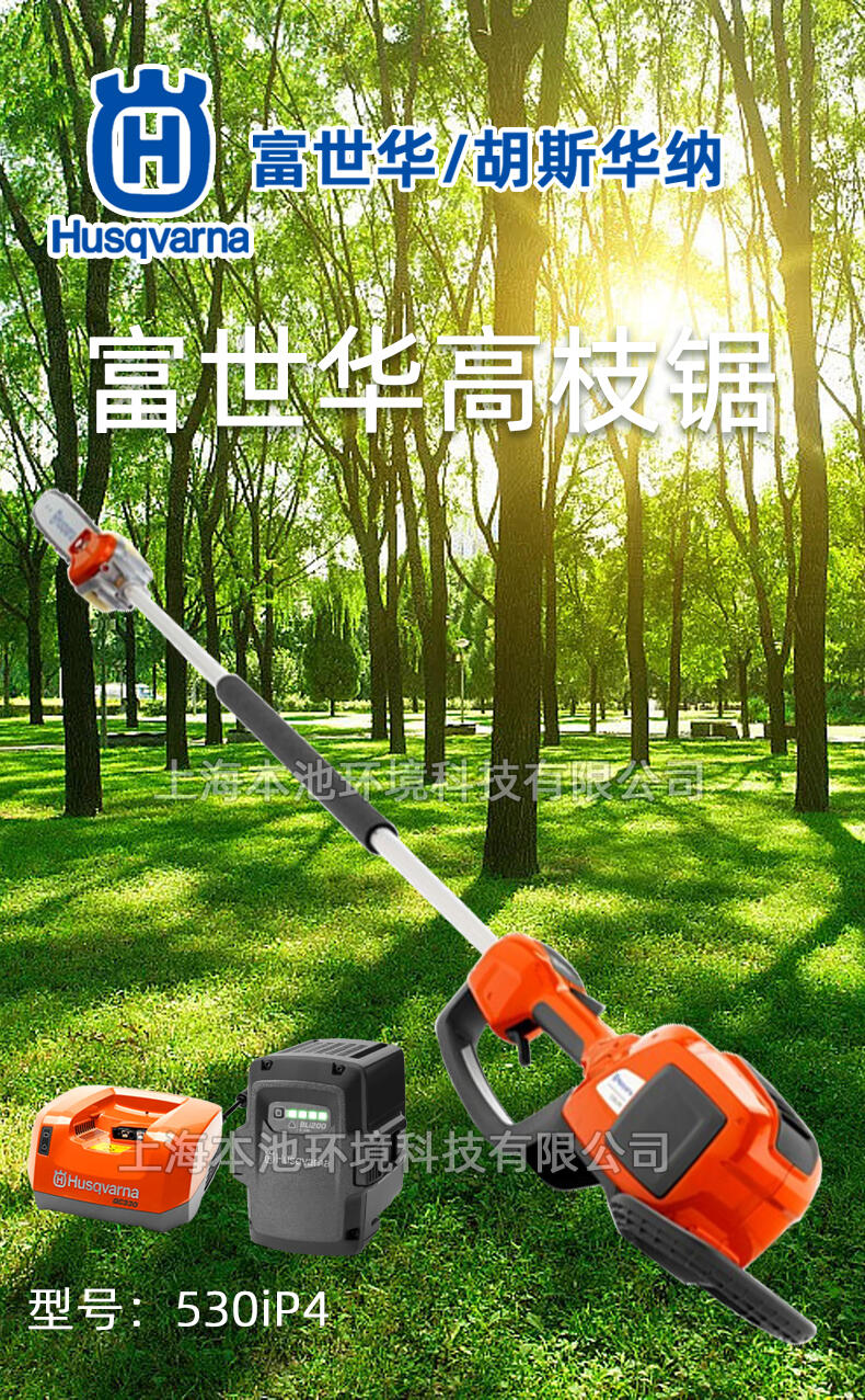 富世华Husqvarna电动高枝锯,530ip4手持式树枝清理锯,无线束缚,工作更轻松,无需插电,无需汽油,便携耐用,轻巧便捷重量3.4千克。无刷电机,合金链条,锋利耐磨,锂电电池,持久续航。适用于不同场合的高空树枝修剪,适用于多种场合:树木修枝,高空修树枝等