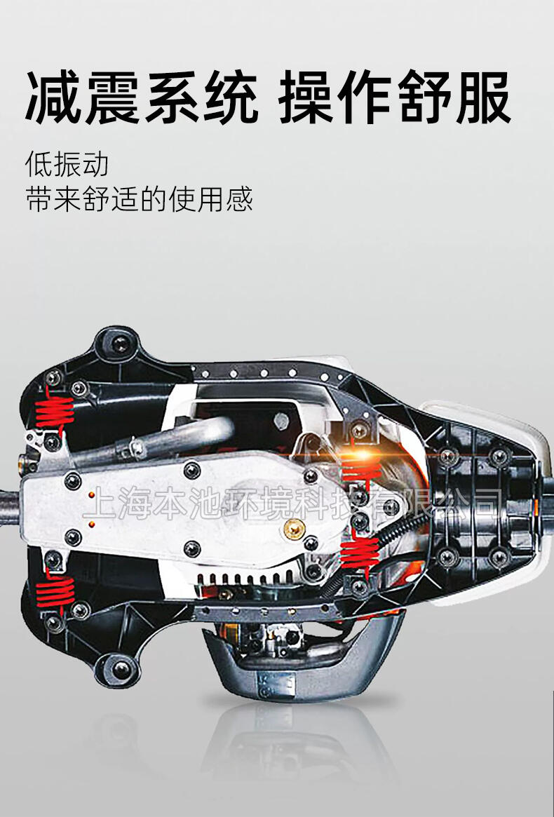 5、操作时,操作者身体应处在化油器一侧,绝不允许处于排气管一端,以免被废气,按工作需要调节控制油门,避免过高转速。
