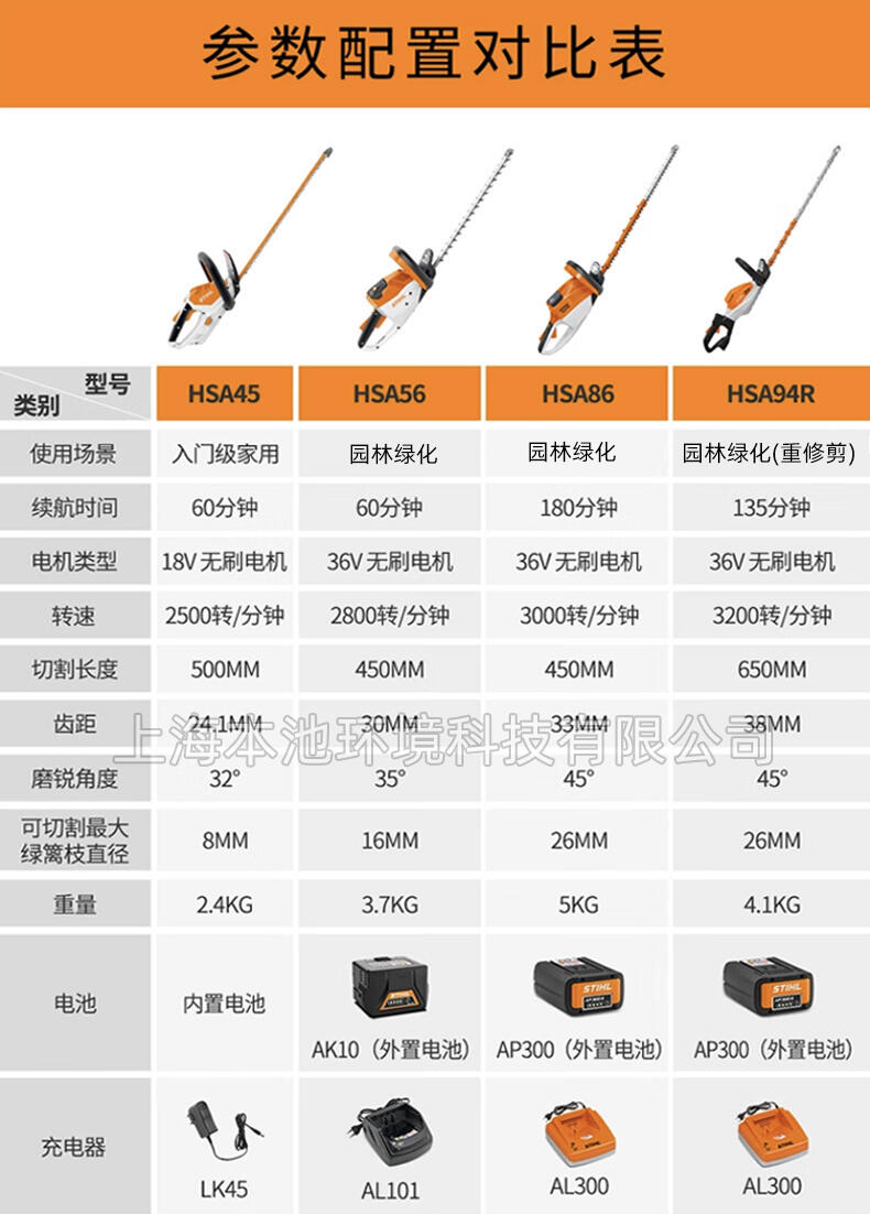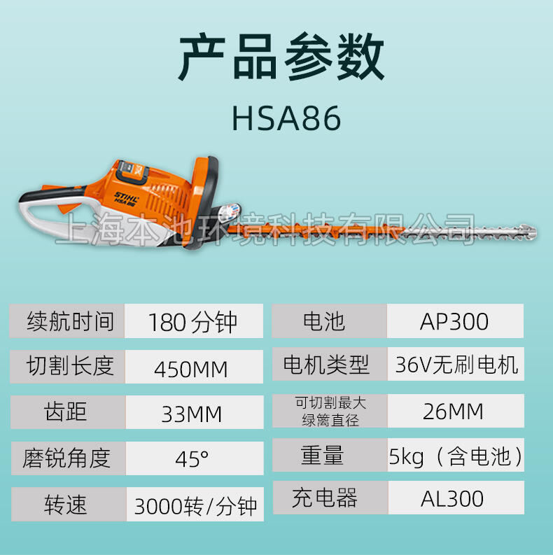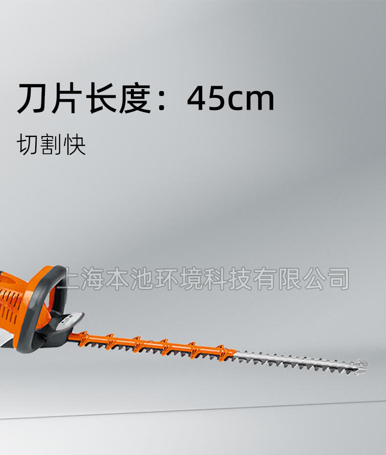 STIHL斯蒂尔HSA86双刃绿篱机,适合园林修剪、茶树剪枝、绿化修边等修理工作。刀片长度为45厘米,轻便省力修剪轻松,有多齿轮转动方式剪枝流畅,可拆卸电池,使用简单便利。外加刀片保护套,在不使用时防护自身不划破皮肤,也对锯齿进行防护。