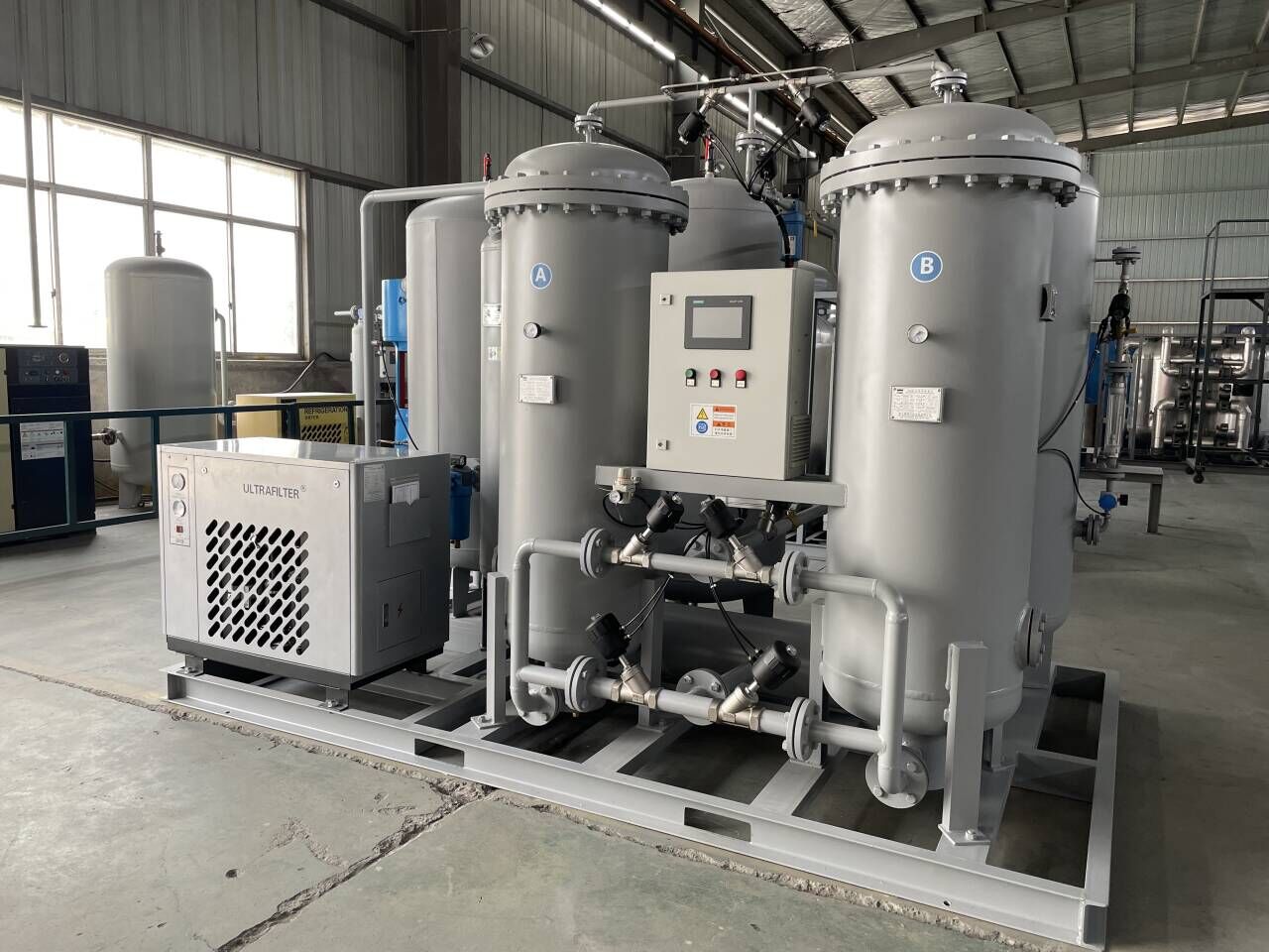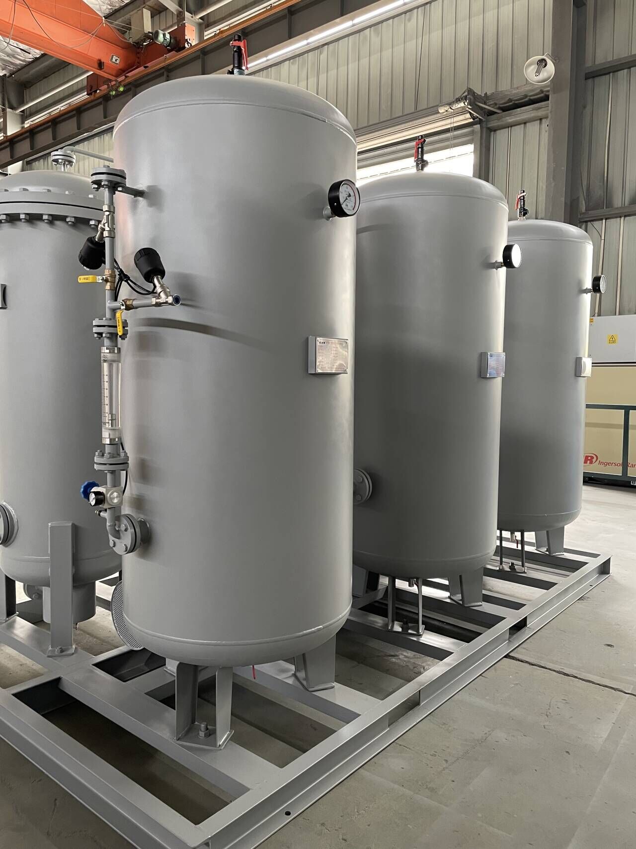 空气储罐的作用是:降低气流脉动,起缓冲作用;从而减小系统压力波动,使压缩空气平稳地通过压缩空气净化组件,以便充分除去油水杂质,减轻后续PSA氧氮分离装置的负荷。同时,在吸附塔进行工作切换时,它也为PSA氧氮分离装置提供短时间内迅速升压所需的大量压缩空气,使吸附塔内压力很快上升到工作压力,保证了设备可靠稳定的运行。