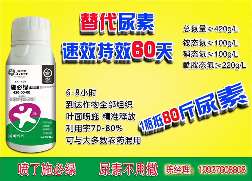 施必绿是新一代特种缓释液体氮肥, 采用国际专利技术,合成不同链长的小分子活性有机氮,速效+持效+缓效, 能够精准控制氮释放时间,更有利于被植物吸收利用。快速水溶,小分子易吸收,短链有机小分子有机氮,能够迅速透过细胞壁,高效被作物吸收利用。速效氮在喷施后即可发挥作用, 喷施作物4-6个小时后,镜检叶片就会发现叶片上布满了氮肥,24-48小时可到达全部组织;持效、缓效氮持效期45-60天,有效的促进作物生长,提高产量。施必绿适合大田、果树、蔬菜、牧草、绿化等作物整个生长期对氮肥的需求,是给作物补充氮营养的优质肥料。替代追肥,方便、省工、安全、高效、环保。