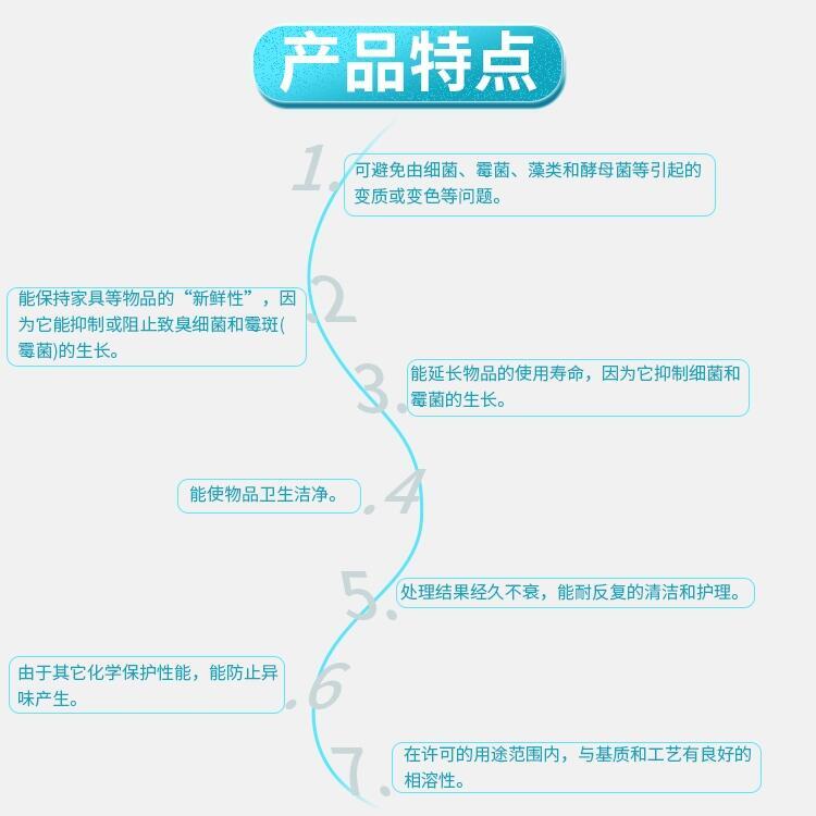 防霉抗菌膏iHeir-QF为白色膏状液体,由多种天然光亮剂、水解丝肽营养保护剂、水性成膜剂,采用纳米抗菌材料和有机安全高效抗菌剂复配而成。属于非释放型的处理剂,不渗失、不游移,也不会被微生物所消耗,以特殊的机械式杀菌(表面进行涂抹),将赋予处理后之基质优越之耐久性,并且对微生物抗菌具有独特的防护功能,以防止微生物所引起的危害,延长皮面的使用寿命,并能强力去污、去霉斑、不伤皮面、防静电、快干、不留痕迹,且能使处理后饱满手感及增加产品价值感。作为耐久性抗微生物处理剂,它具有广泛的抗菌活性。对诸如霉菌、藻类和酵母菌都有耐久性抗菌效果。