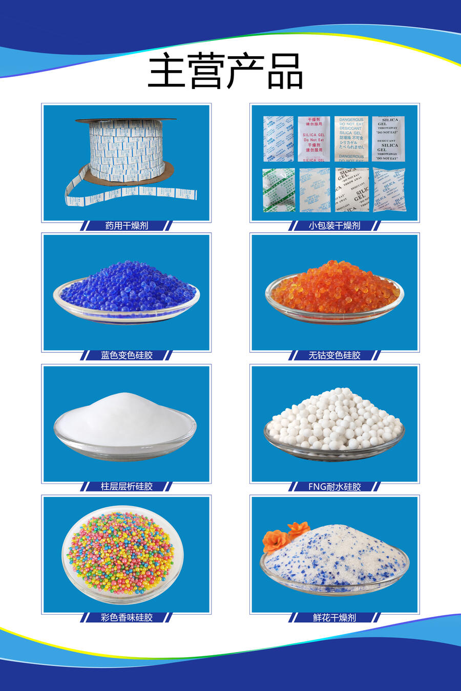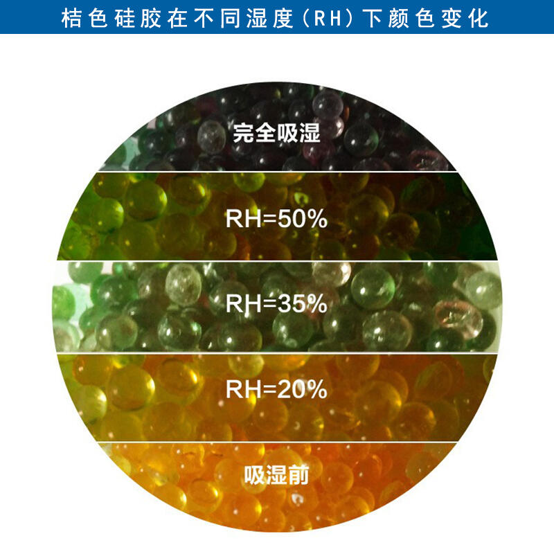 橙色变色硅胶为球形或不规则形状的颗粒,外观为的橙黄色,其主要成分为二氧化硅,颜色随湿度不同而变化,未受潮时为橙黄色,随着自身吸附水分的增加而逐渐变成绿色、墨绿色。