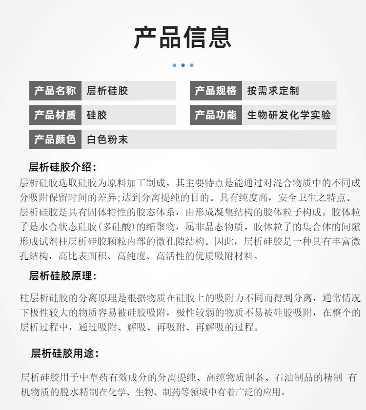 层析硅胶选取粗孔硅胶为原料加工制成。其主要特点是能通过对混合物质中的不同成分吸附保留时间的差异;达到分离提纯的目的。具有纯度高,安全卫生之特点。层析硅胶是具有固体特性的胶态体系,由形成凝集结构的胶体粒子构成。胶体粒子是水合状态硅胶(多硅酸)的缩聚物,属非晶态物质。胶体粒子的集合体的间隙形成试剂柱层析硅胶颗粒内部的微孔隙结构。因此,层析硅胶是一种具有丰富微孔结构,高比表面积、高纯度、高活性的优质吸附材料。