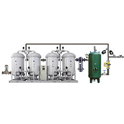 空气压缩机提供的压缩空气首先通入压缩空气净化组件中,压缩空气先由精密过滤器除去大部分的油、水、尘,再经冷冻干燥机进一步除水、精过滤器除油、除尘,并由在紧随其后的活性炭过滤器进行深度净化。根据系统工况,瑞德气体特别设计了一套压缩空气除油器,用来防止可能出现的微量油渗透,为碳分子筛提供充分保护。设计严谨的空气净化组件确保了碳分子筛的使用寿命。经本组件处理后的洁净空气可用于仪表空气。