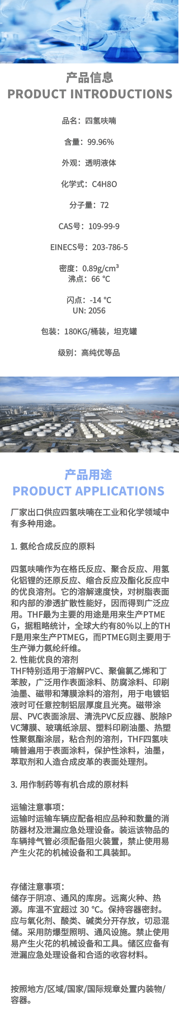 厂家出口供应国标高纯优等品四氢呋喃 内销原装新桶包装 专注四氢呋喃厂家出口 陆运海运多式联运均可办理危包商检手续 商检外部专用桶 包装 180KG/桶 ISO TANK FOB CIF EXW FCA 青岛 宁波上海 龙口 珲春阿拉山口各大口岸一站式出口供应服务 印度 韩国 非洲 委内瑞拉均可四氢呋喃客户群体、