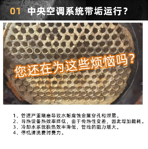 2.冷却水系统每吨加清洗药剂5-8kg,冷冻水系统每吨加清洗药剂3-4kg,分别分两次加入。第一次加入计划药量的一半,运行15天后,排放一半污水。再补足清水,加入剩余的一半药剂,再运行10-20天后,用清水置换清洗废液至清澈。