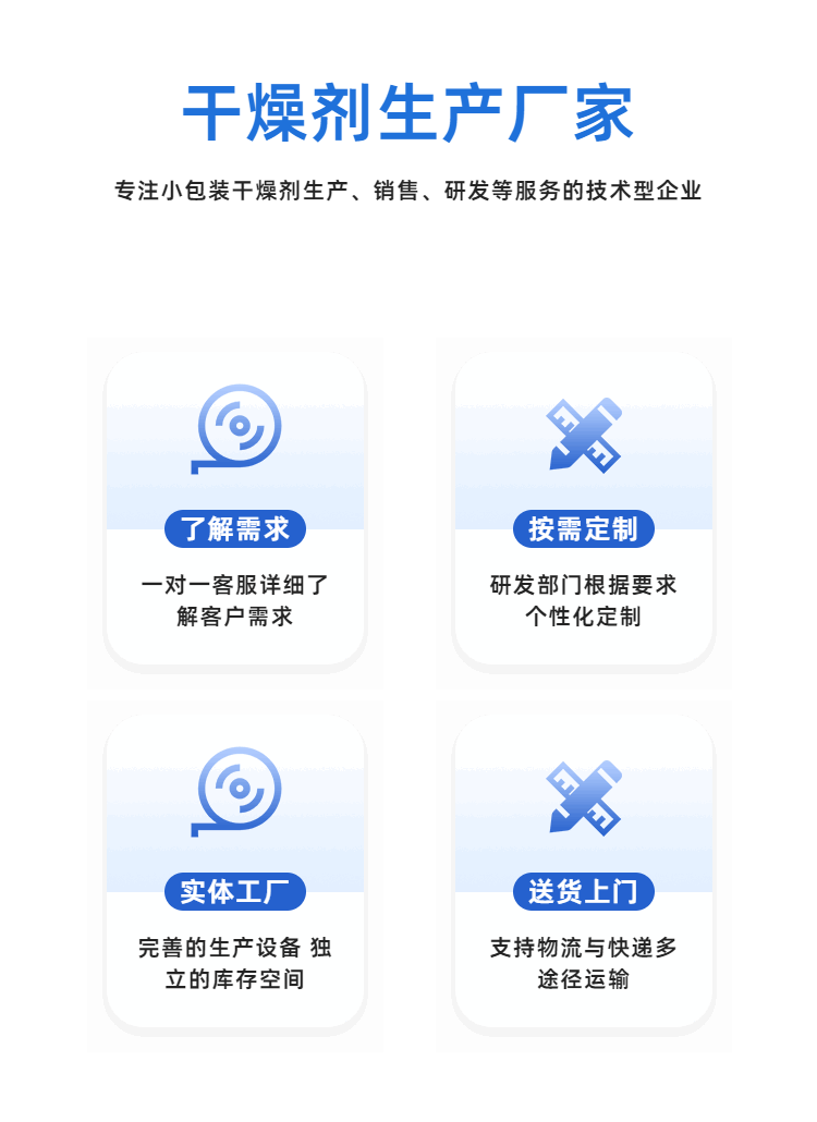 小包装干燥剂主要成分为二氧化硅,是把硅胶装在透气性小袋中加工而成,可以方便的放置在各种物品的包装中起防潮、防锈、防止霉变和异味的作用。仪器仪表、服装鞋帽、集装箱运输和家庭衣柜及各种物品防潮都可适用。