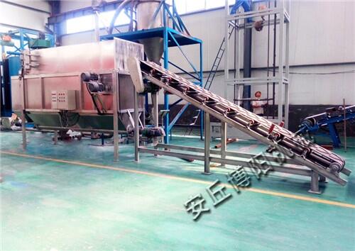 袋装粉粒体物料由皮带输送机传送至45度角的滑板上并依靠重力沿滑板下滑,在下滑过程中由快速转动的铁片将包装袋割开,被割开的残袋和物料滑入滚筒筛进行筛分。从滚筒筛落下的物料由螺旋输送机输出,破损的包装袋、杂质、结块物料被滚筒筛带出机体。割片破袋过程中引起的粉尘由布袋式除尘器捕获并抖落入螺旋输送机(由螺旋输送机输出的物料可通过我公司的管链输送机或者气力输送装置,输送至至物料储罐中)。