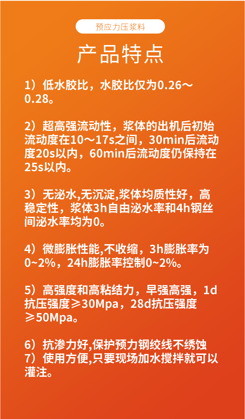 特点 | 流动性好 ≥5h 饱满早强 微膨胀零泌水粘结牢固////高强无收缩 | ||