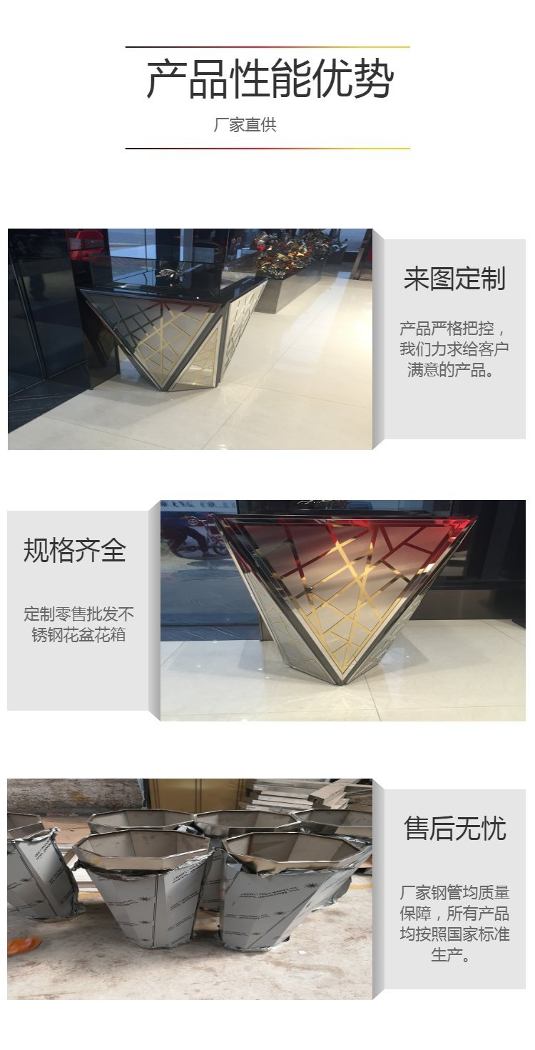 不锈钢花盆系列,适用于现代建筑装饰,其产品造型新颖独特、美观大方、坚固耐用、不易破碎。该产品美观时尚,外表更加、华丽、气派,适用于城市休闲街、家庭居室、宾馆酒店、机场大厅、地铁轻轨站、商务楼、商业购物中心、会展中心等摆设。不锈钢花盆表面效果有拉丝、喷砂、镜面、亚光、抛光、烤漆等。有多种款式及规格供客户选择,并可按客户图纸及要求定做。