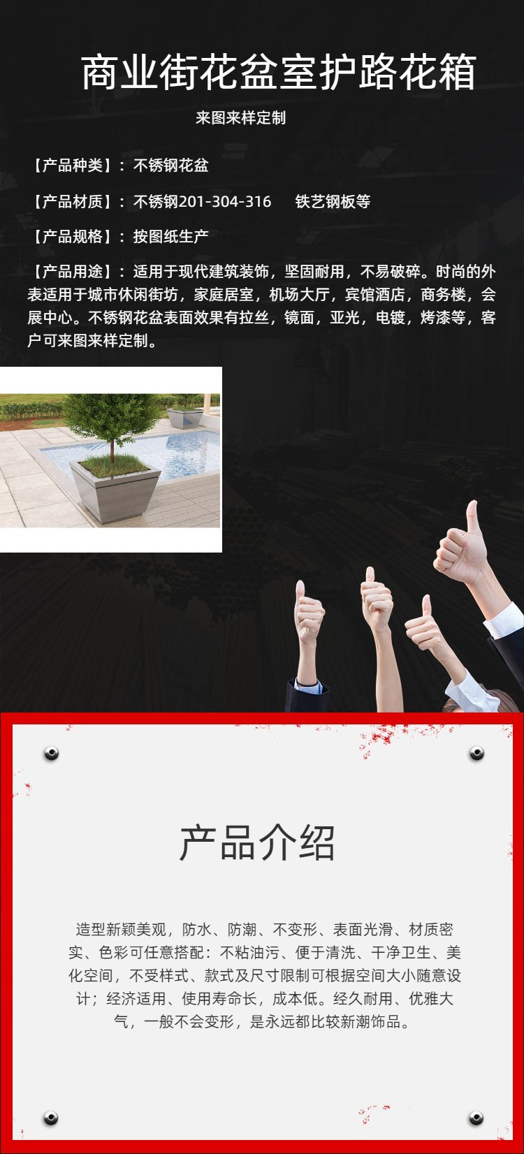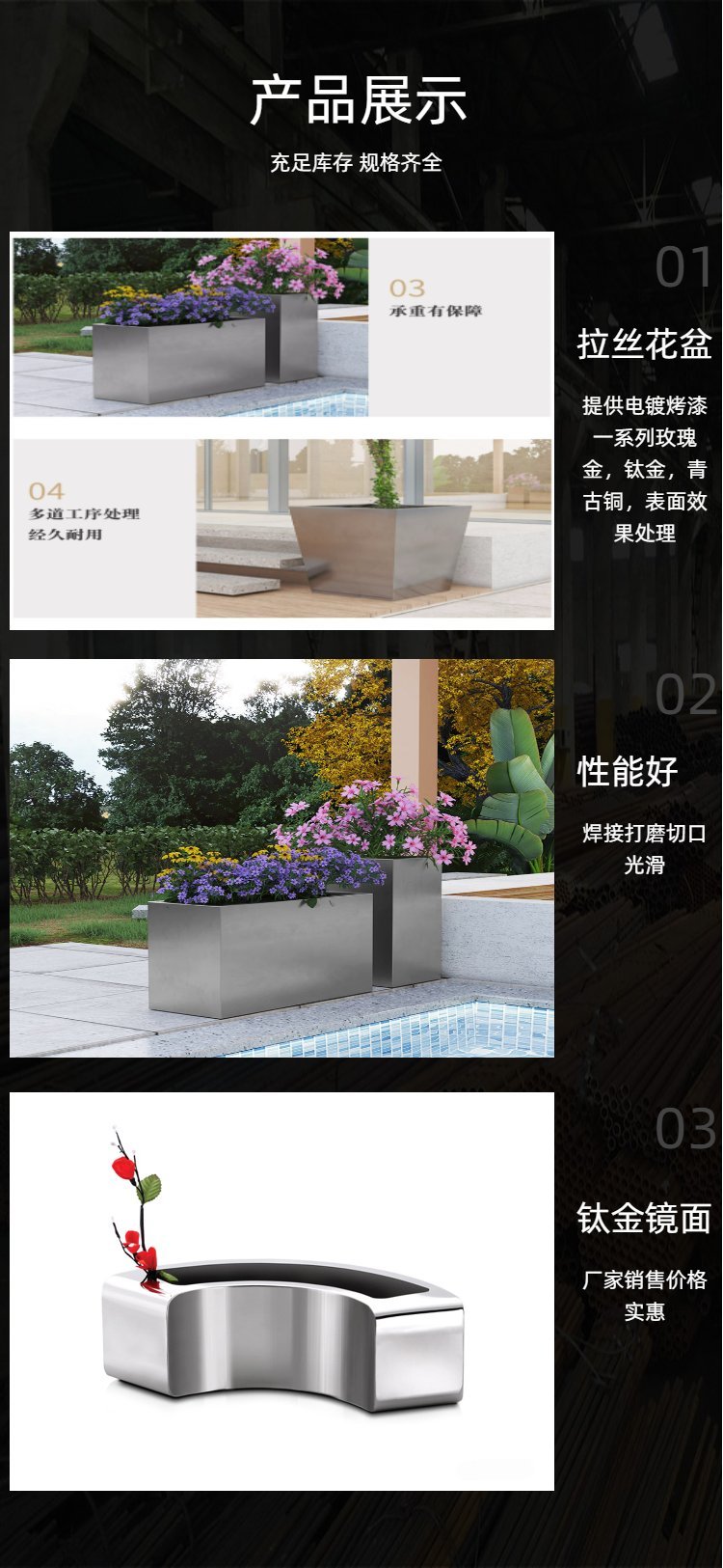 不锈钢花盆镀色,不锈钢落地花盆,不锈钢花盆表面加工厂,公园不锈钢花盆,商场不锈钢大花盆等系列不锈钢花盆产品;不锈钢花盆/花瓶表面加工等。不锈钢花瓶花盆系列,适用于现代豪华建筑装饰,其产品造型新颖独特、美观大方、坚固耐用、不易破碎。该产品美观时尚,外表更加高贵、华丽、气派,适用于城市休闲街、家庭居室、高档会所、宾馆酒店、机场大厅、地铁轻轨站、商务楼、商业购物中心、会展中心等摆设。不锈钢花盆表面效果有拉丝、喷砂、镜面、亚光、抛光、烤漆等。有多种款式及规格供客户选择,并可按客户图纸及要求定做